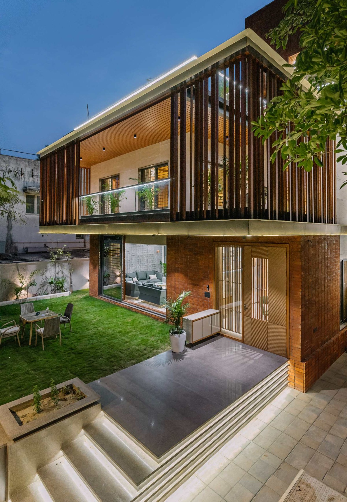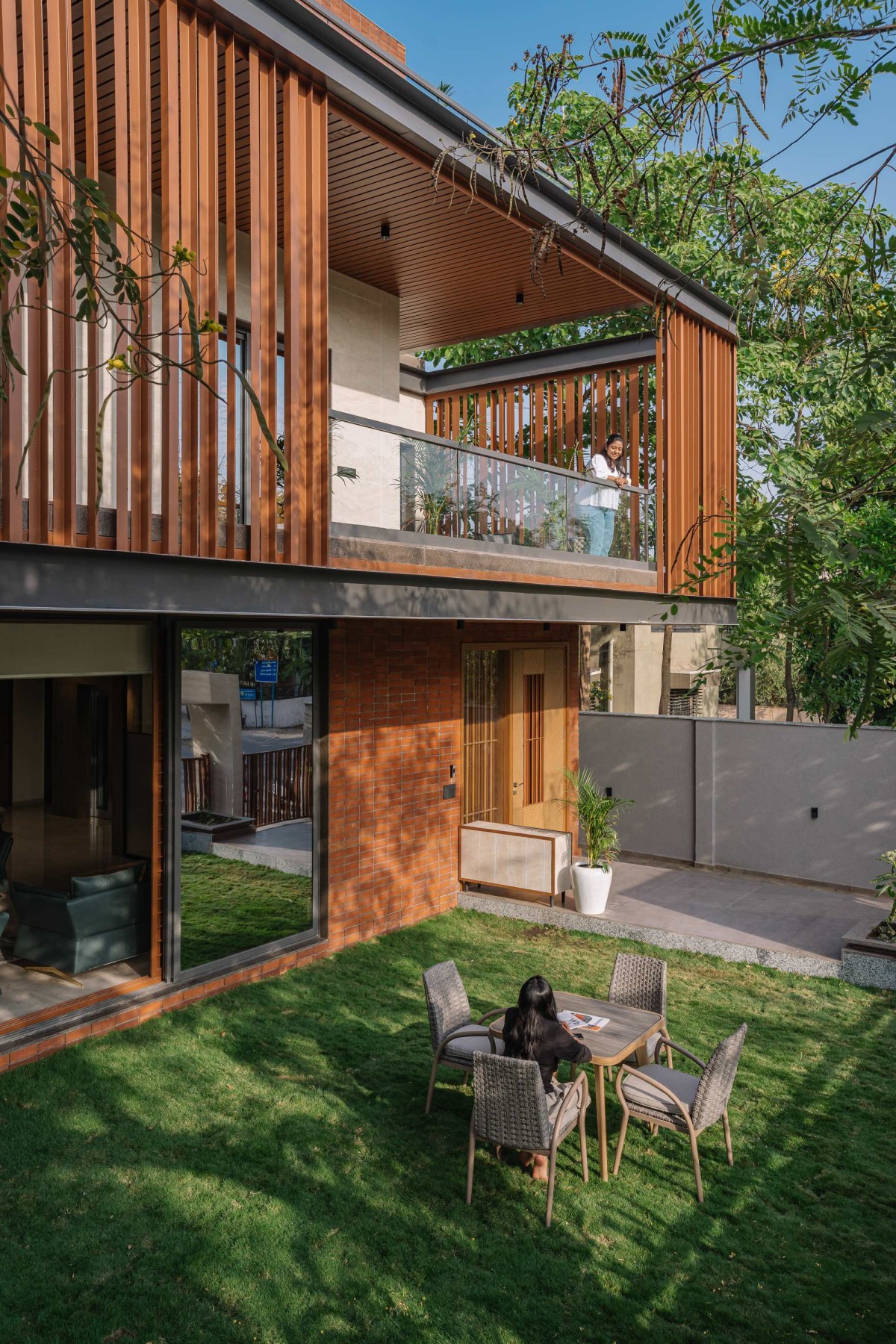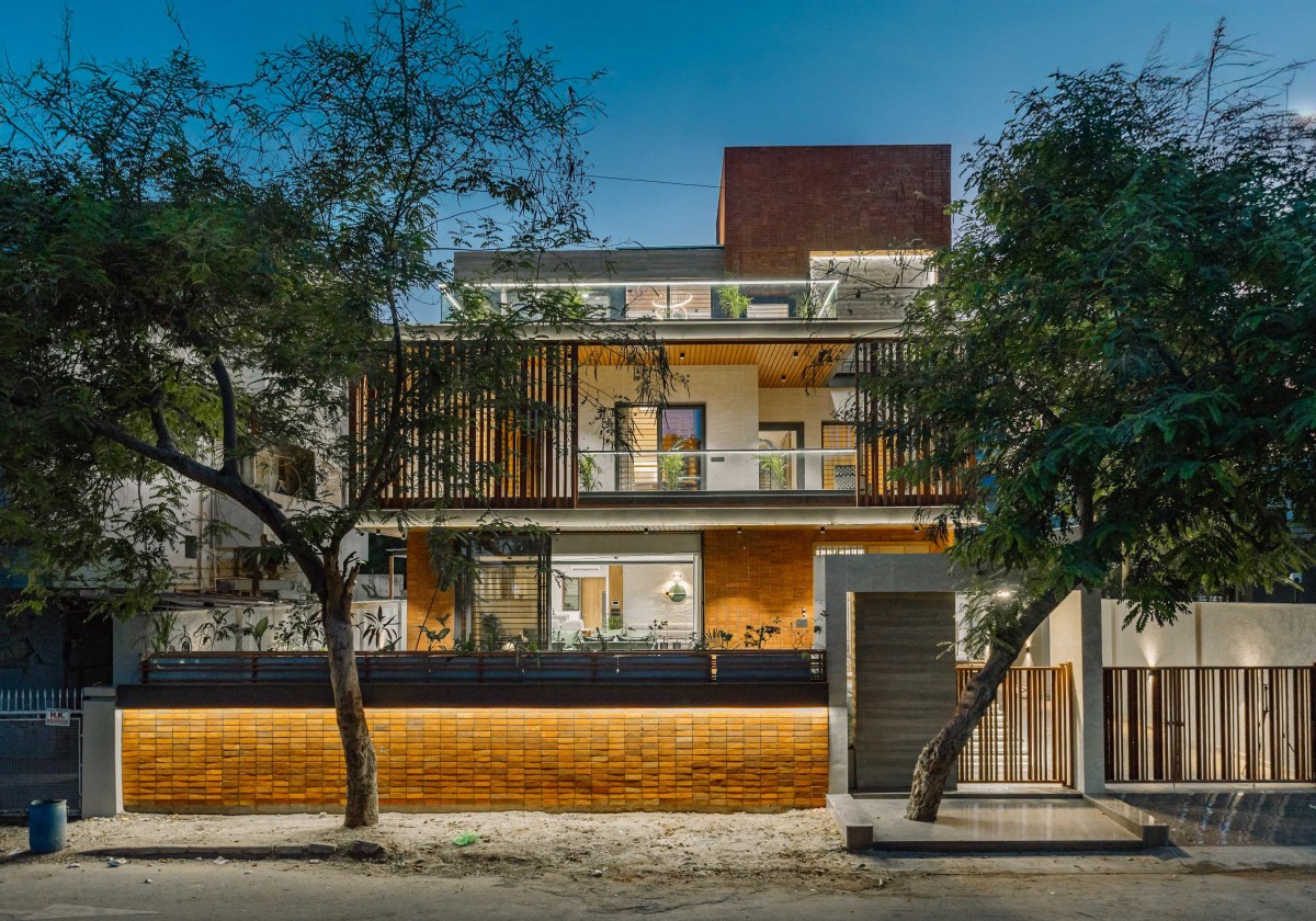 A material palette of exposed brick, earthy cladding, wooden planks, and intricate screens gives the house a bold yet grounded façade, while interiors combine wood, stone, and textured finishes for a warm, modern aesthetic.