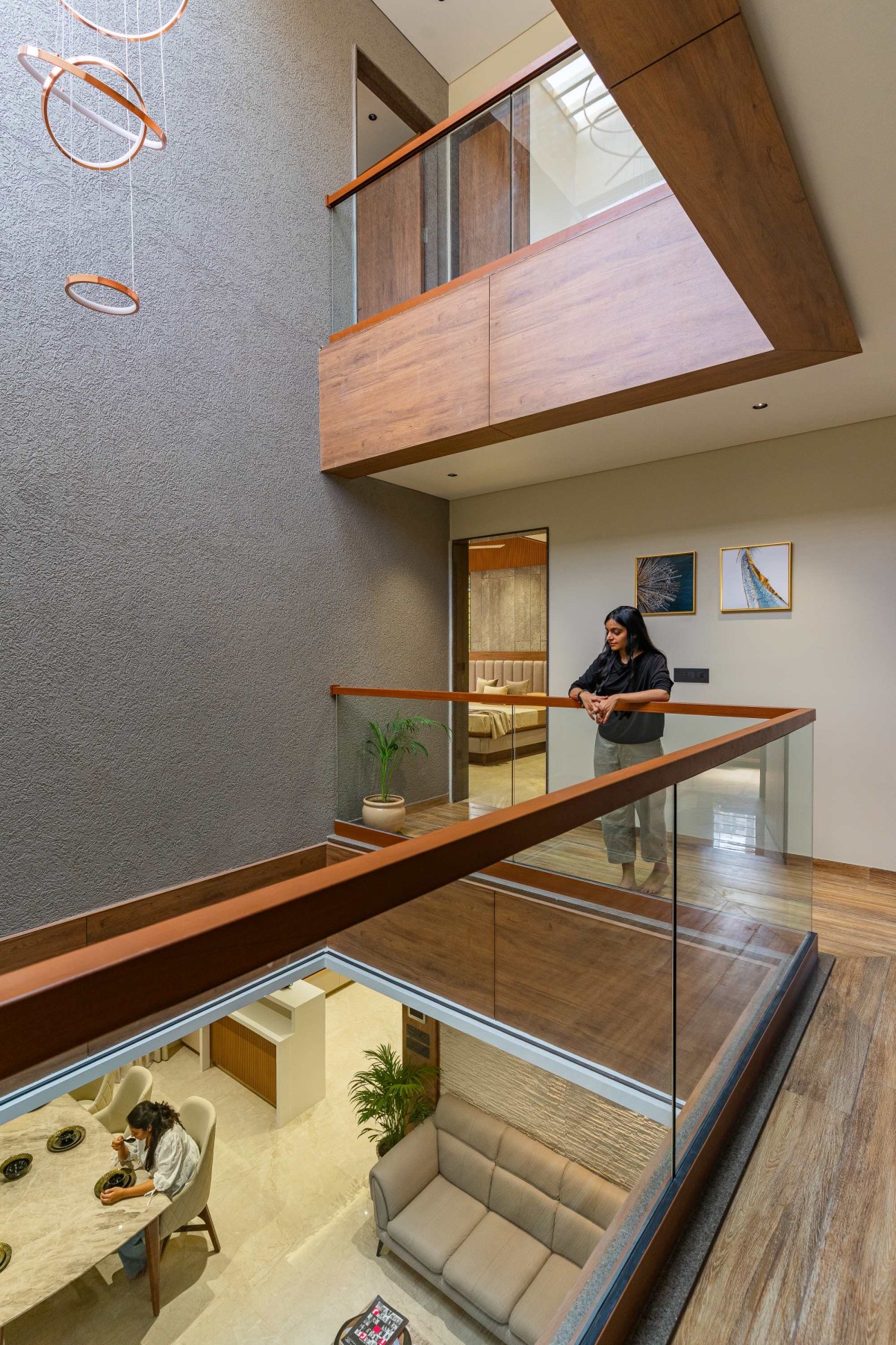 On the first floor, a cantilevered passage overlooks the family core and connects the bedrooms. The master suite in front extends into a large screened balcony, creating patterns of light and shadow while maintaining privacy. The son’s and daughter’s bedrooms, each with their own balconies, ensure every space enjoys an outdoor extension.