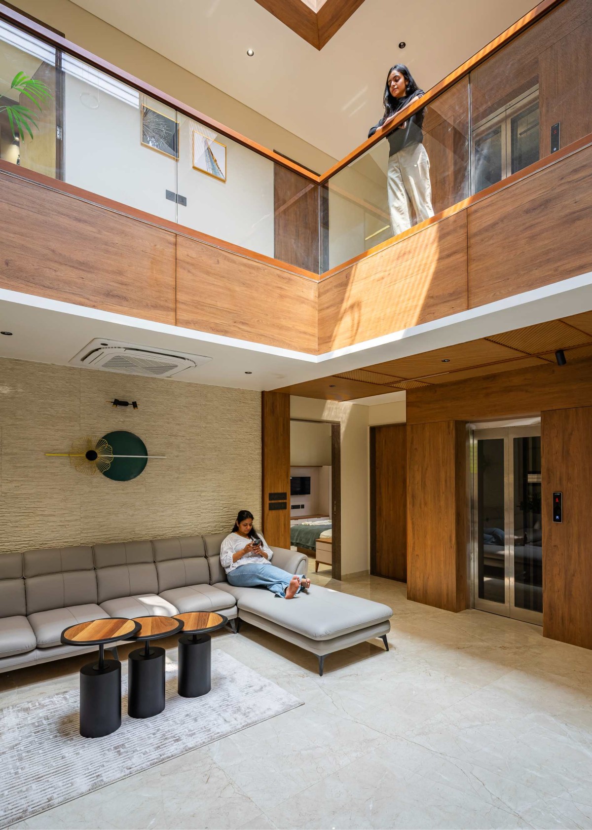 Planning evolved around three principles: breathability, connectivity, and openness. The ground floor is divided into public, private, and connective zones. A double-height family sitting area, lit by a skylight, becomes the home’s heart, visually linking all floors. The drawing room opens to a lush garden, while the dining extends into a semi-covered verandah. A spacious modular kitchen and a parents’ bedroom with attached sit-out complete this level.