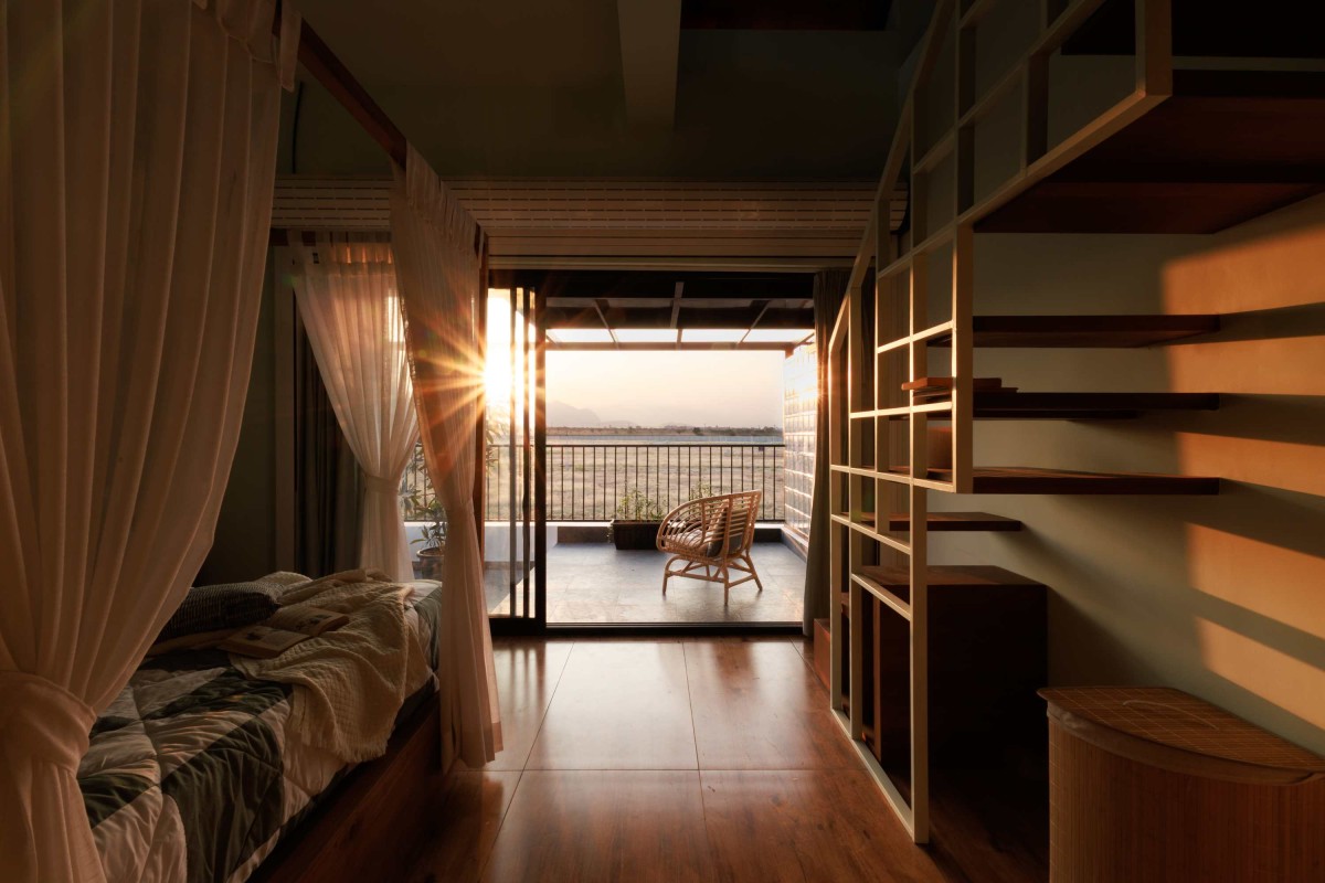 The private spaces continue this design language, with expansive balconies offering panoramic views of the landscape. The bedrooms are crafted as intimate sanctuaries, with custom-built shelving, soft drapery, and a natural material palette enhancing the cozy atmosphere. A loft-like mezzanine and carefully curated decor elements further elevate the design narrative.