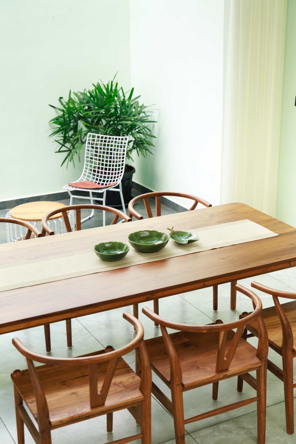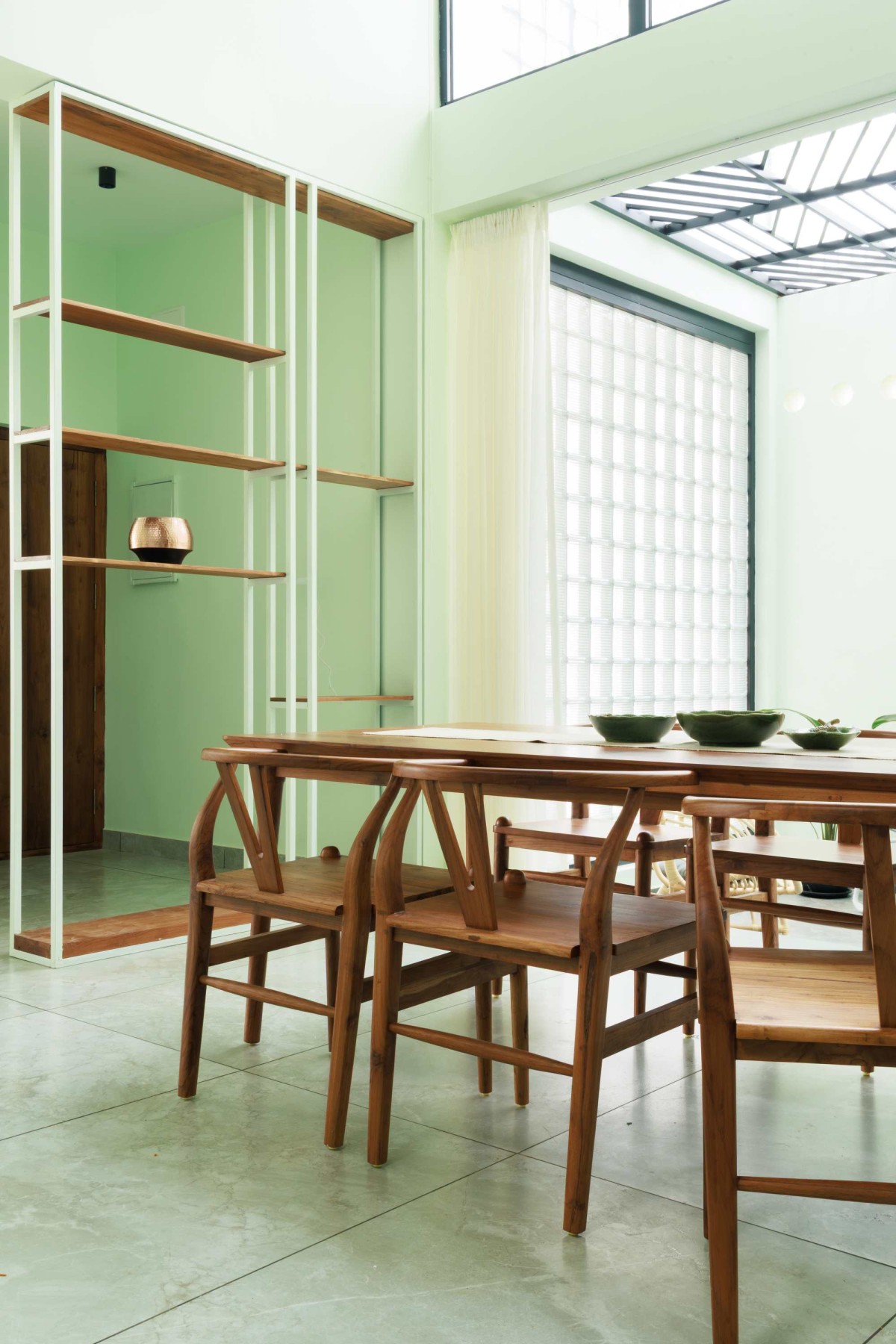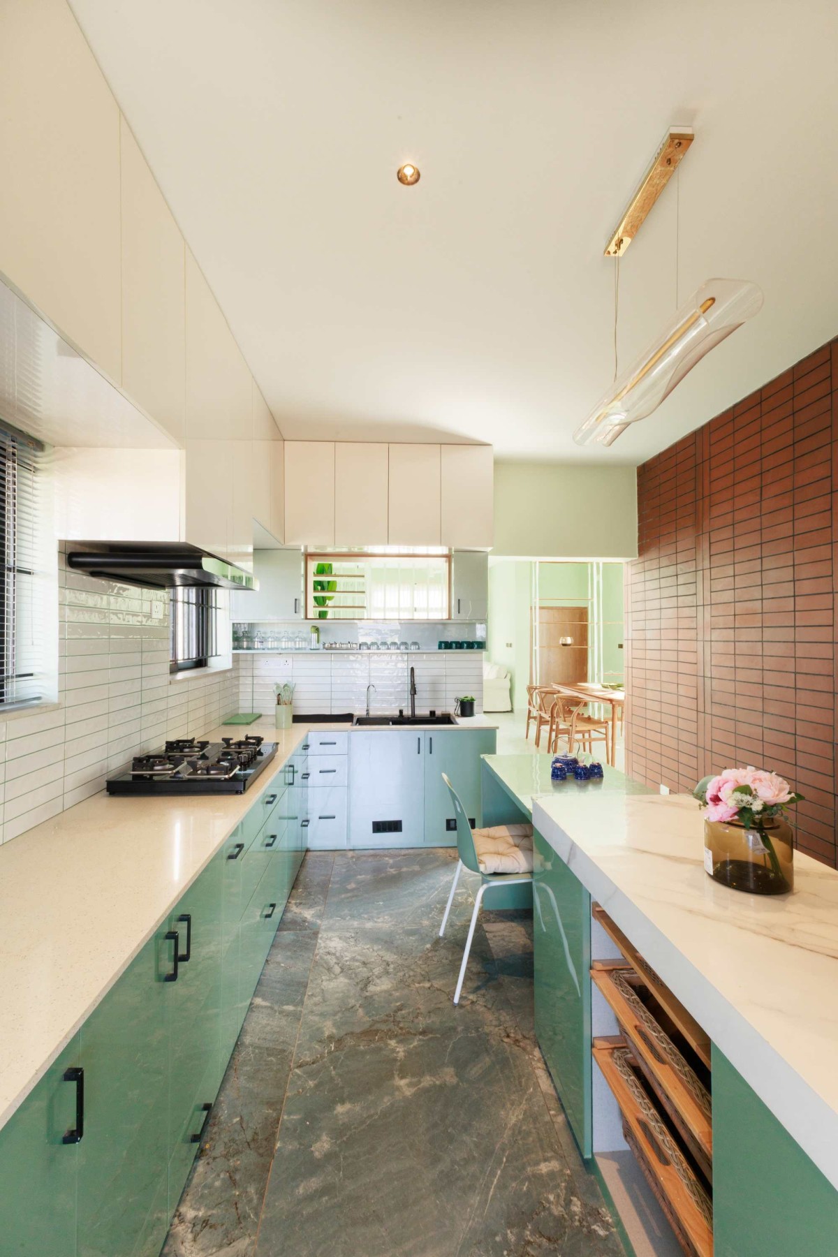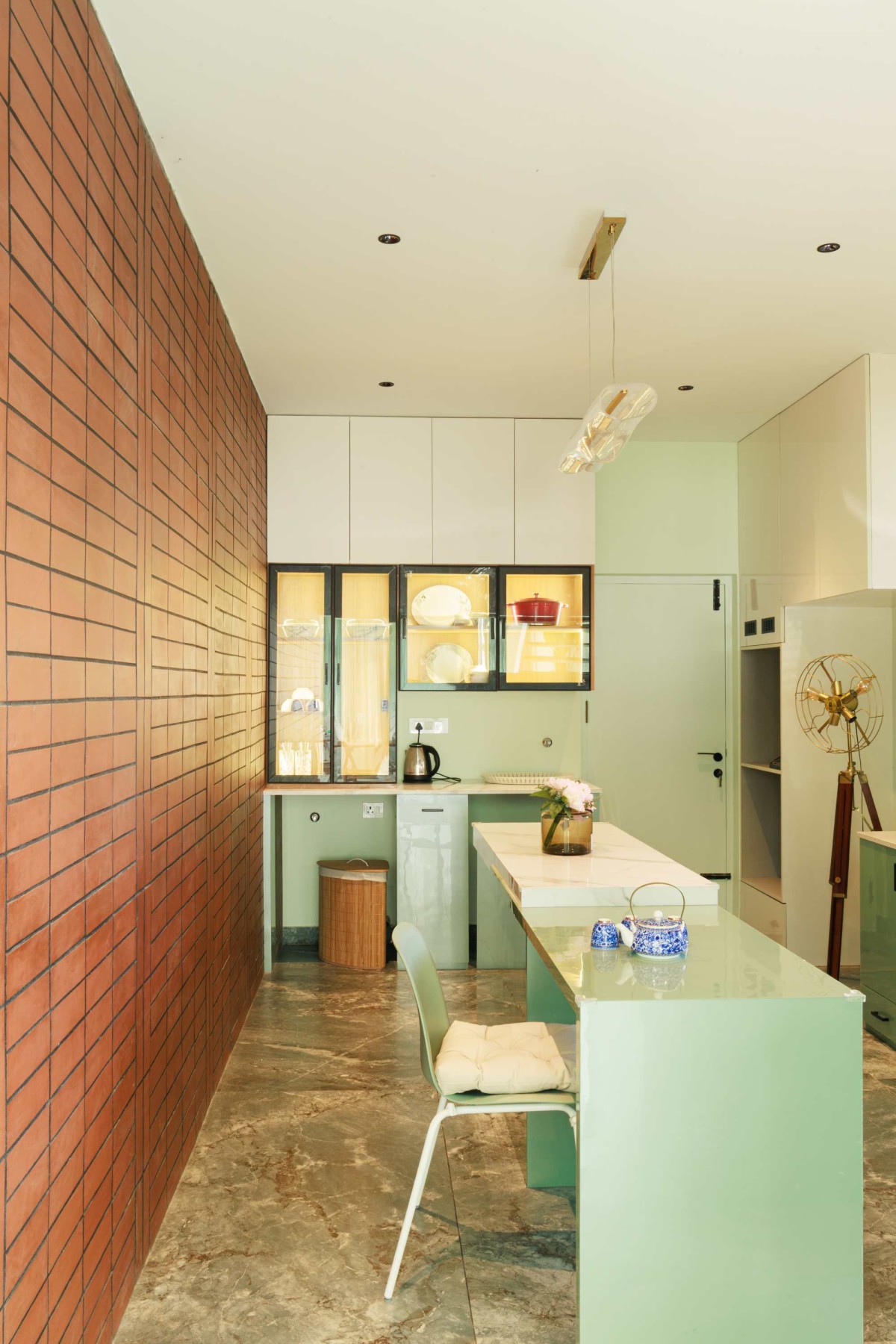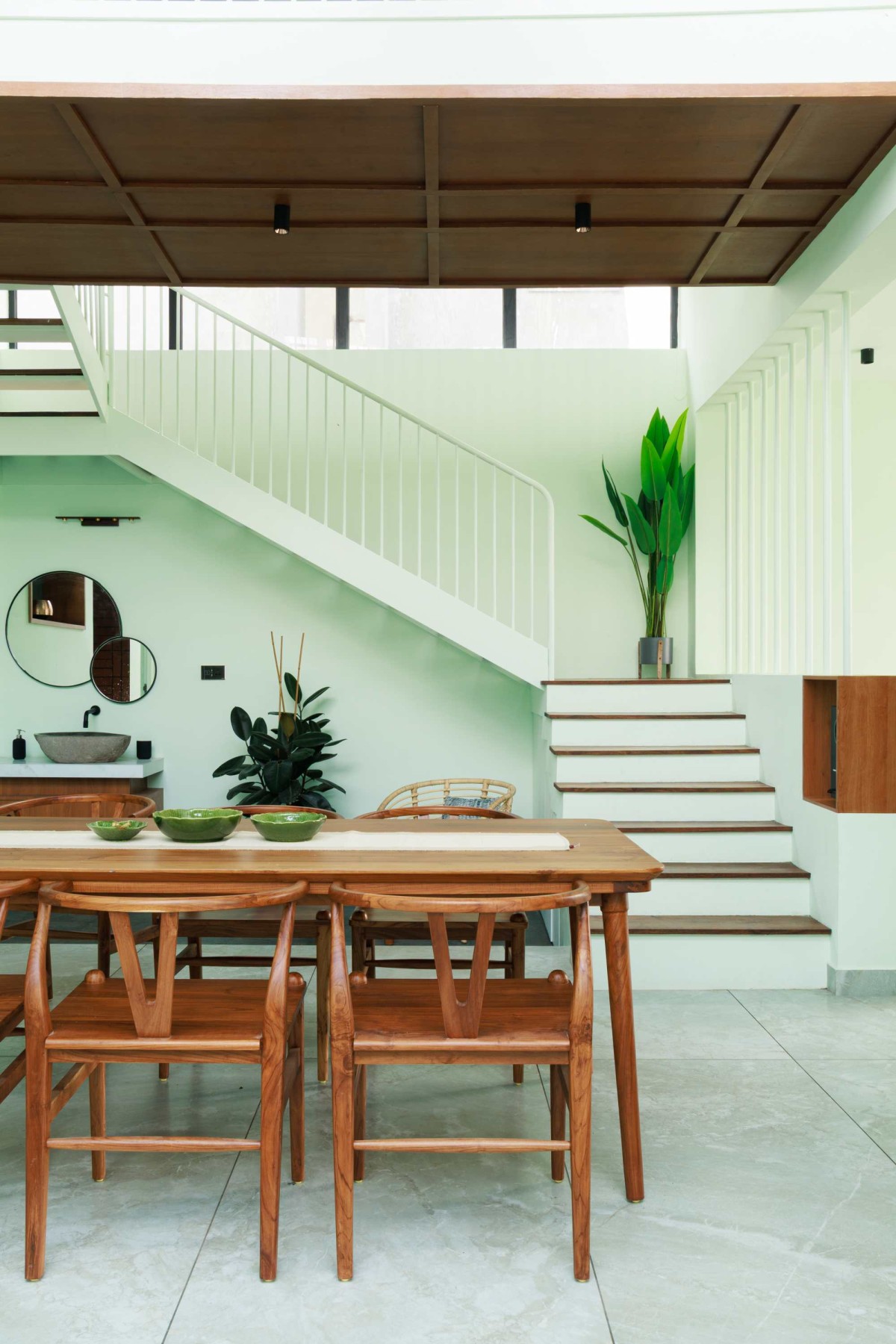 Inside, a soothing green color palette defines the space, harmonized by wooden furniture and natural stone flooring. The open-plan dining and living areas exude a sense of calm, with handcrafted teak wood furniture adding a layer of timeless elegance. The kitchen, marked by a bold brick accent wall, integrates functionality with aesthetic appeal, making it the heart of the home.