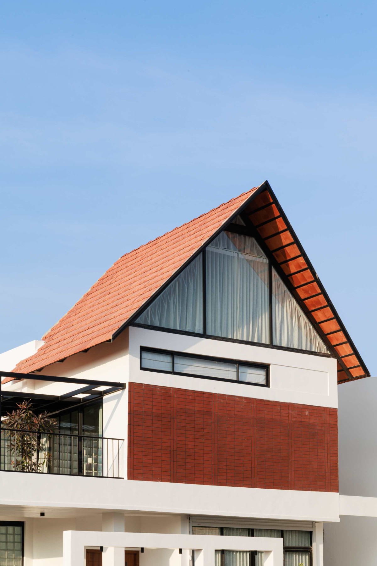 The exterior showcases a bold A-frame roof with exposed steel rafters, a nod to vernacular architecture, while modern white walls and terracotta cladding create a balanced visual contrast. Large openings ensure natural light floods the interiors, establishing a seamless indoor-outdoor connection.