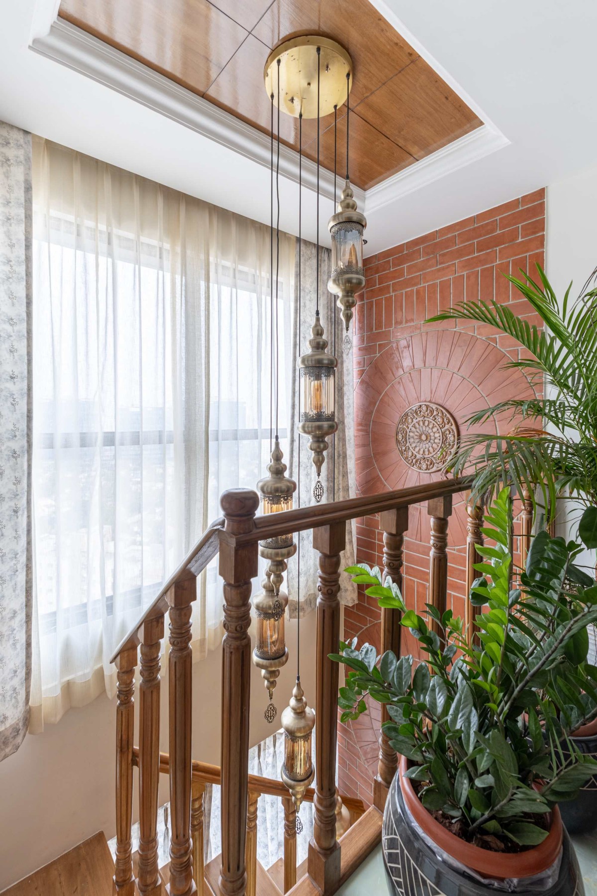 A cluster of antique-finish pendant lanterns suspended from a wooden ceiling panel enhances the height of the space, casting a warm ambient glow. Soft daylight filtering through sheer drapes balances the richness of textures, making the staircase both a functional transition zone and a sculptural highlight of the home.