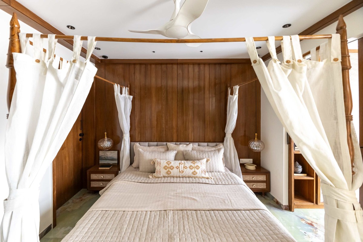 The master bedroom at Shilpagriha is a seamless blend of warmth, craftsmanship, and understated elegance. Wrapped in rich wooden paneling, the space exudes a cozy yet sophisticated character. The custom four-poster bed, detailed with sheer flowing drapes, becomes the focal point—adding a soft, romantic charm while maintaining a grounded, earthy aesthetic.