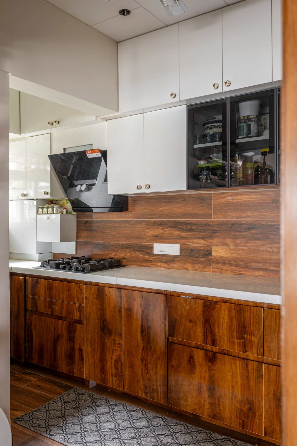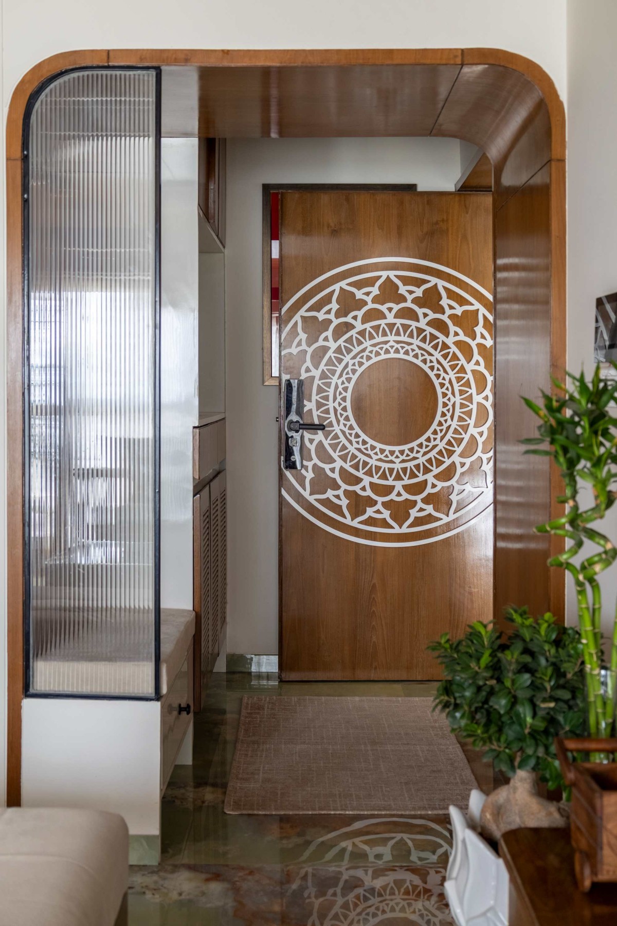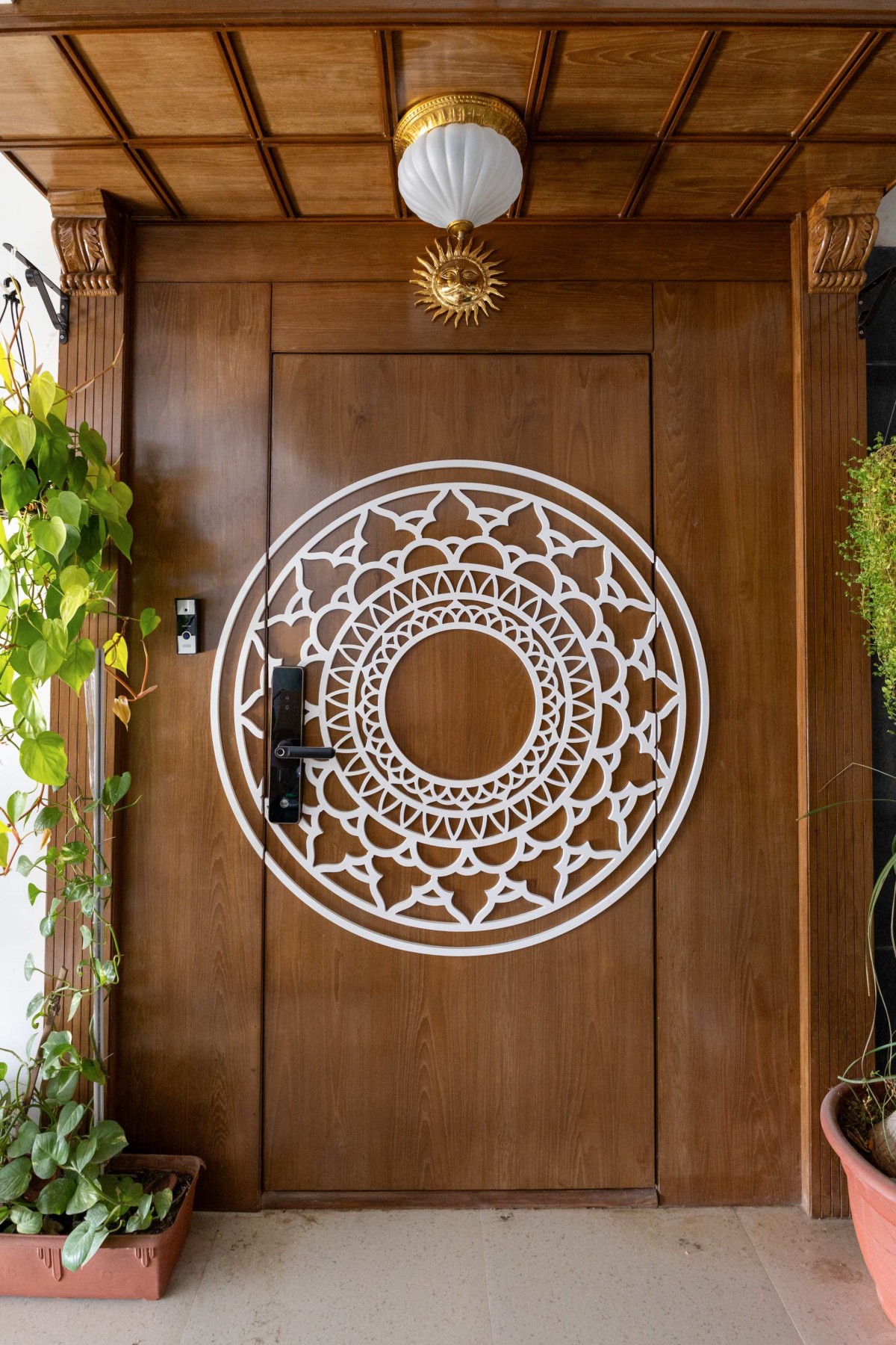 The entrance sets the narrative for the entire home. Designed as a statement element, this doorway blends warm wooden textures with an intricately detailed mandala motif that becomes the focal point of the space. The circular geometry symbolizes harmony and balance, while the surrounding architectural framing adds depth and character. Subtle layers of material, light, and texture come together to create an inviting threshold one that welcomes with warmth and quietly introduces the design language of the home within.