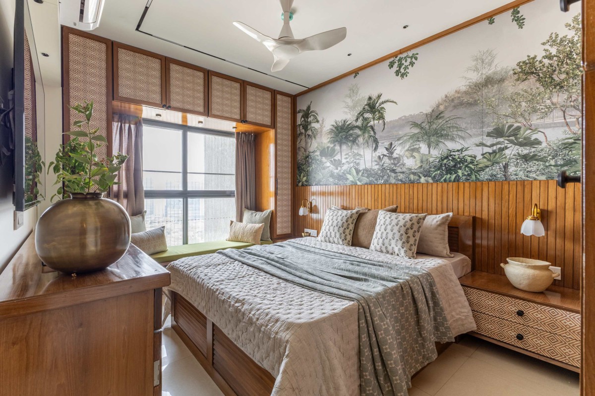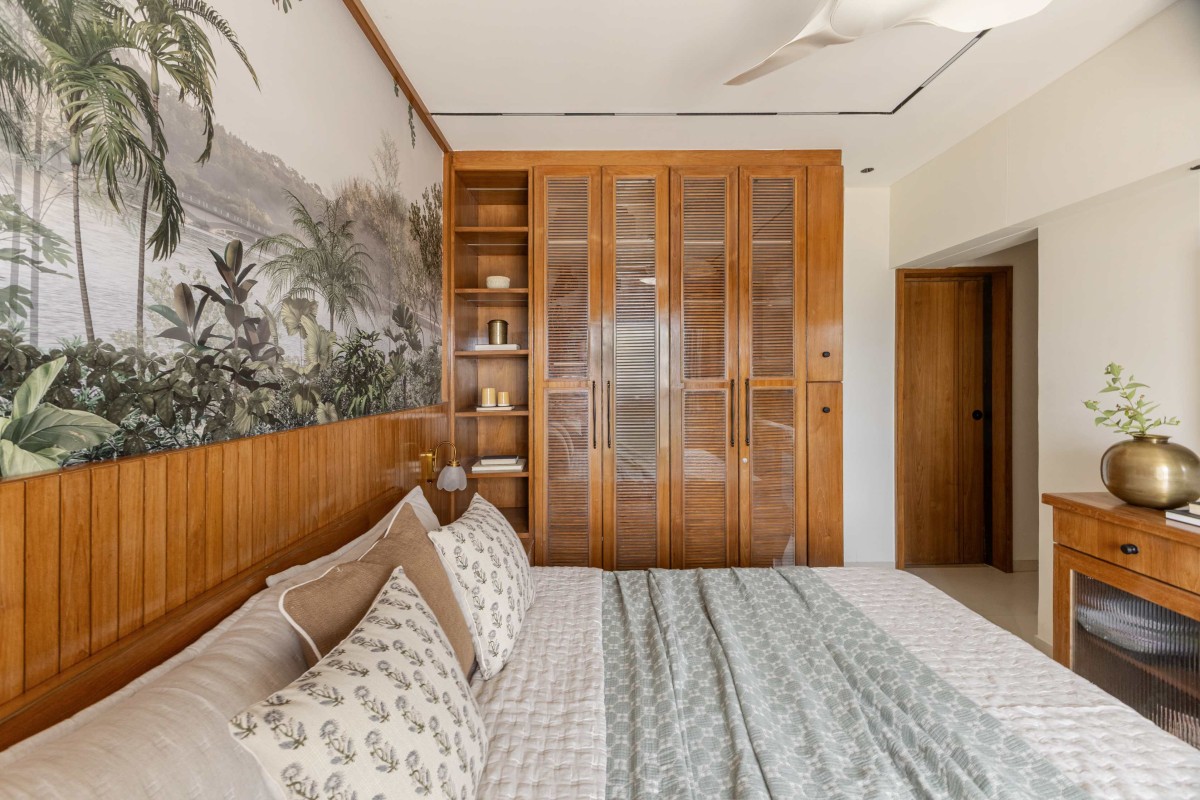 A bedroom where warmth meets craftsmanship. Teak-toned paneling and woven cane shutters celebrate traditional detailing, while the tropical mural softly extends the space, creating depth and serenity. Layered linens, subtle brass accents, and seamlessly integrated storage balance aesthetics with functionality — shaping a retreat that feels timeless, grounded, and quietly luxurious.