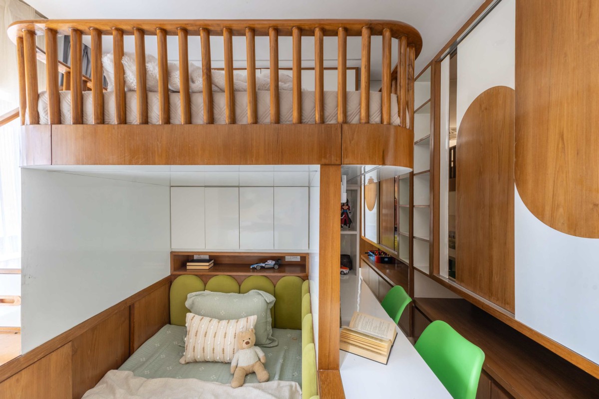 The kids' bedroom at Shilpagriha is designed as a balance of functionality and playful warmth. A custom-crafted wooden bunk bed with soft curves and rounded spindle railings becomes the focal element, creating a sense of safety and visual lightness. The staircase is thoughtfully designed with integrated storage drawers, maximizing utility without compromising aesthetics.