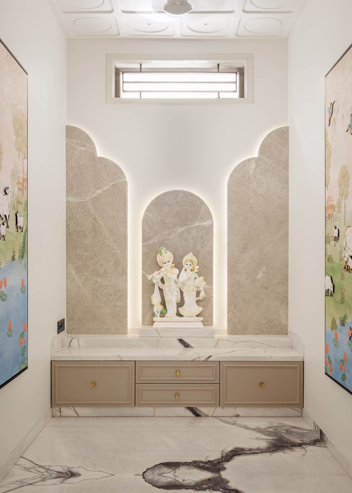 The pooja room remains visually light with sculptural Italian marble forms and two large pichwai artworks.