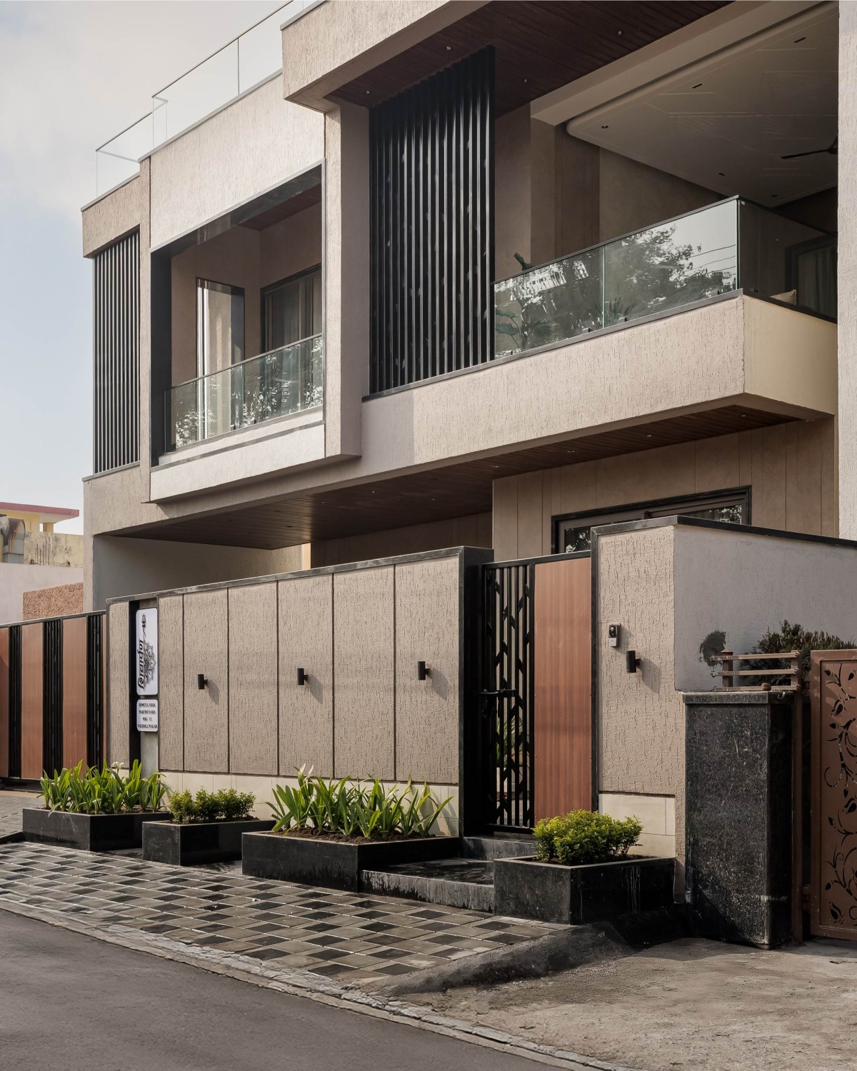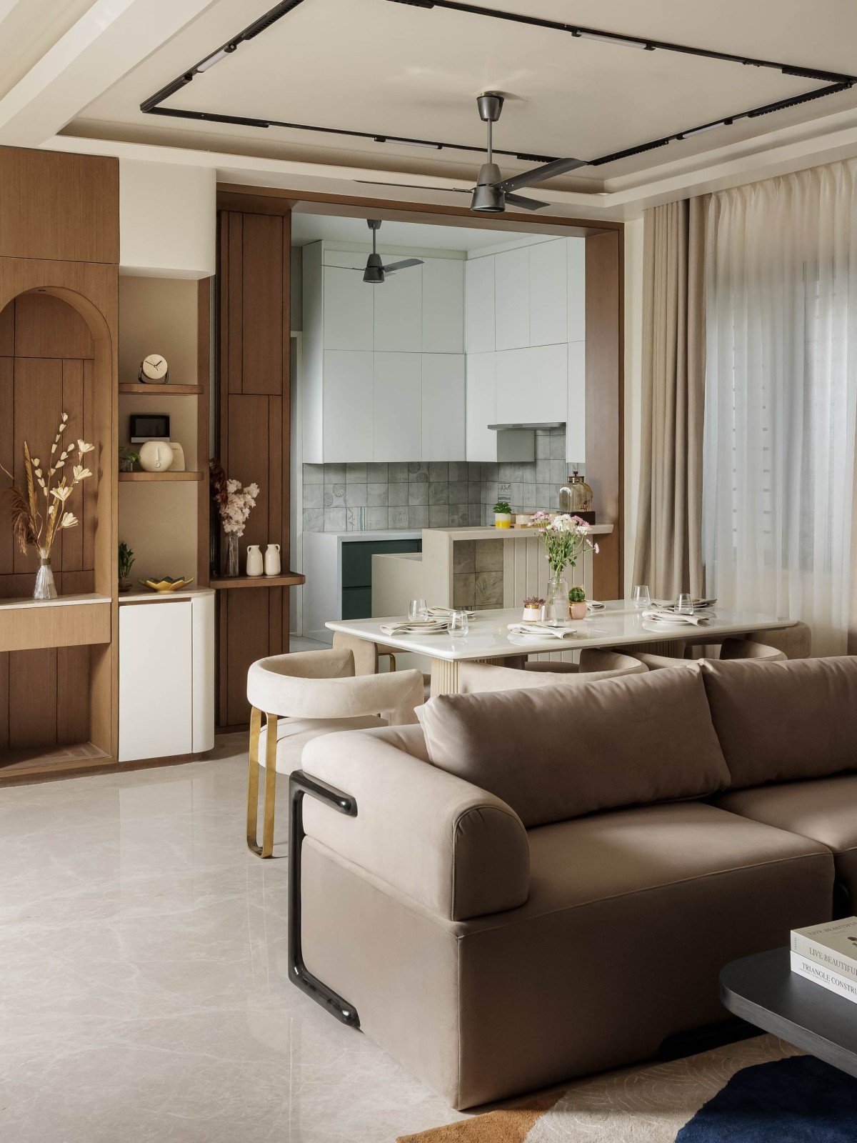Moving deeper into the house, the communal areas unfold in a soft spectrum of beige, connected by a recurring motif of arches. A sliding partition allows the spaces to be separated when necessary while maintaining a sense of openness. The dining area features a six-seater table with ribbed, tapering legs and an onyx marble top, complemented by brass-finished chairs. Nearby, a cleverly designed crockery unit conceals the electrical board behind veneer panels, blending functionality with design.