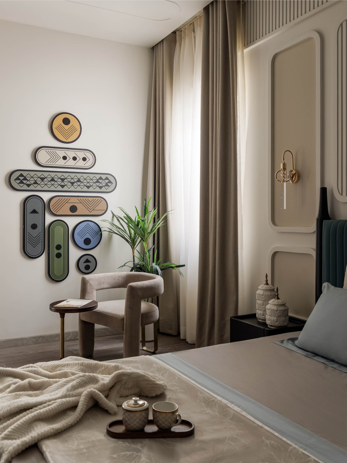 The private rooms reflect individual personalities. The master suite emphasizes calm with clean lines, softened by gentle curves and anchored by a teal four-poster bed. A reading nook by the window, accented with bohemian artwork, provides a peaceful retreat. The son’s room features a bold 3D tree mural within a circular inset and a concealed door leading to a walk-in wardrobe with chevron-patterned rattan and fluted glass shutters. A study nook with floating shelves and a rocking chair adds functionality. The daughter’s room adopts softer tones with stucco-textured paint, floral sconces, and delicate décor, while the guest bedroom introduces cooler greys balanced by wooden artworks.