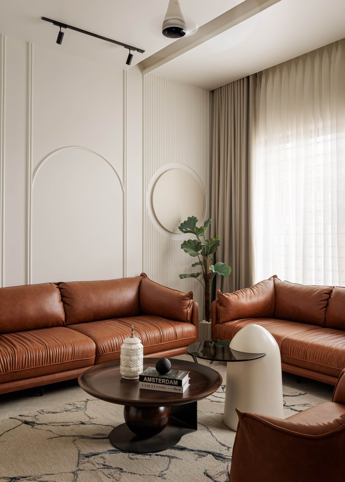 The formal living room continues the home’s measured aesthetic. Tan leather seating is paired with a sculptural coffee table, introducing varied geometry into the space. This interplay of curves and angular forms adds visual interest while maintaining balance. Terracotta frames along one wall echo the warm tones of the furniture and reinforce the earthy palette.