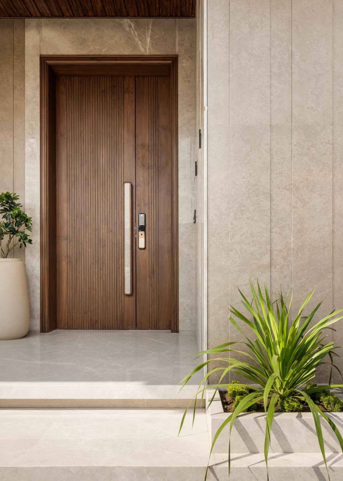 Named Shivarpan, the residence expresses reverence subtly rather than through overt symbolism. The porch sets the tone with Italian marble flooring paired with a teakwood main door accented by a marble-finished handle. Inside, the foyer creates a quiet yet meaningful welcome through a lotus motif embossed on the wall. Rather than serving as mere decoration, the element gently acknowledges the significance of arrival.