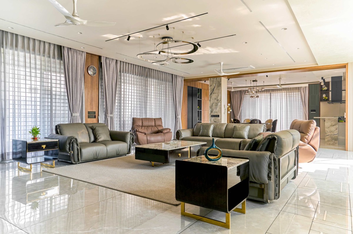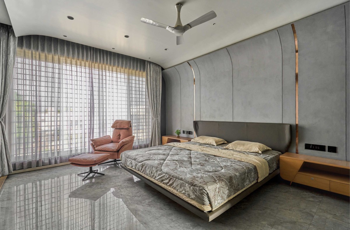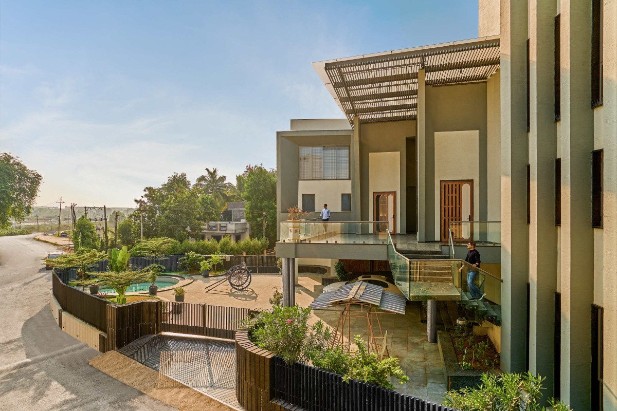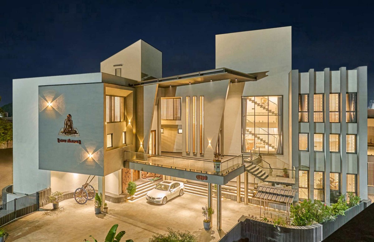 Shraddha is a bespoke residence for two brothers, Rajan and Nilesh, on a triangular corner plot. The initial brief was for twin bungalows with identical specifications, reflecting the common desire to visibly “separate” into two homes while sharing family land. The clients sought generous private spaces, clear segregation of individual families, and adequate parking and guest facilities. The challenge lay in resolving the awkward triangular geometry without compromising Vastu, privacy, or architectural dignity. The final brief—evolved through dialogue—was to create two fully equipped, independent family homes within a single, unified bungalow that expresses togetherness, offers crafted and personalized experiences for each family, and presents one strong, elegant frontage to the city.