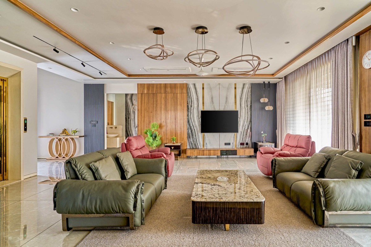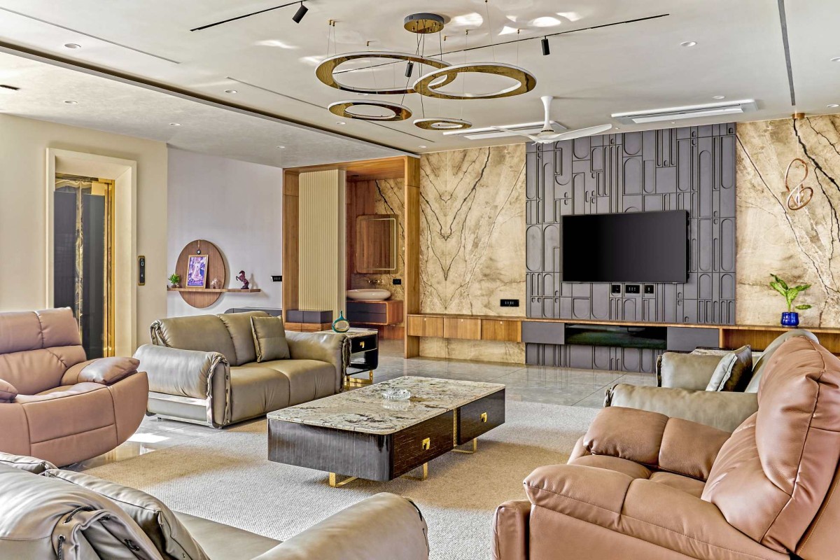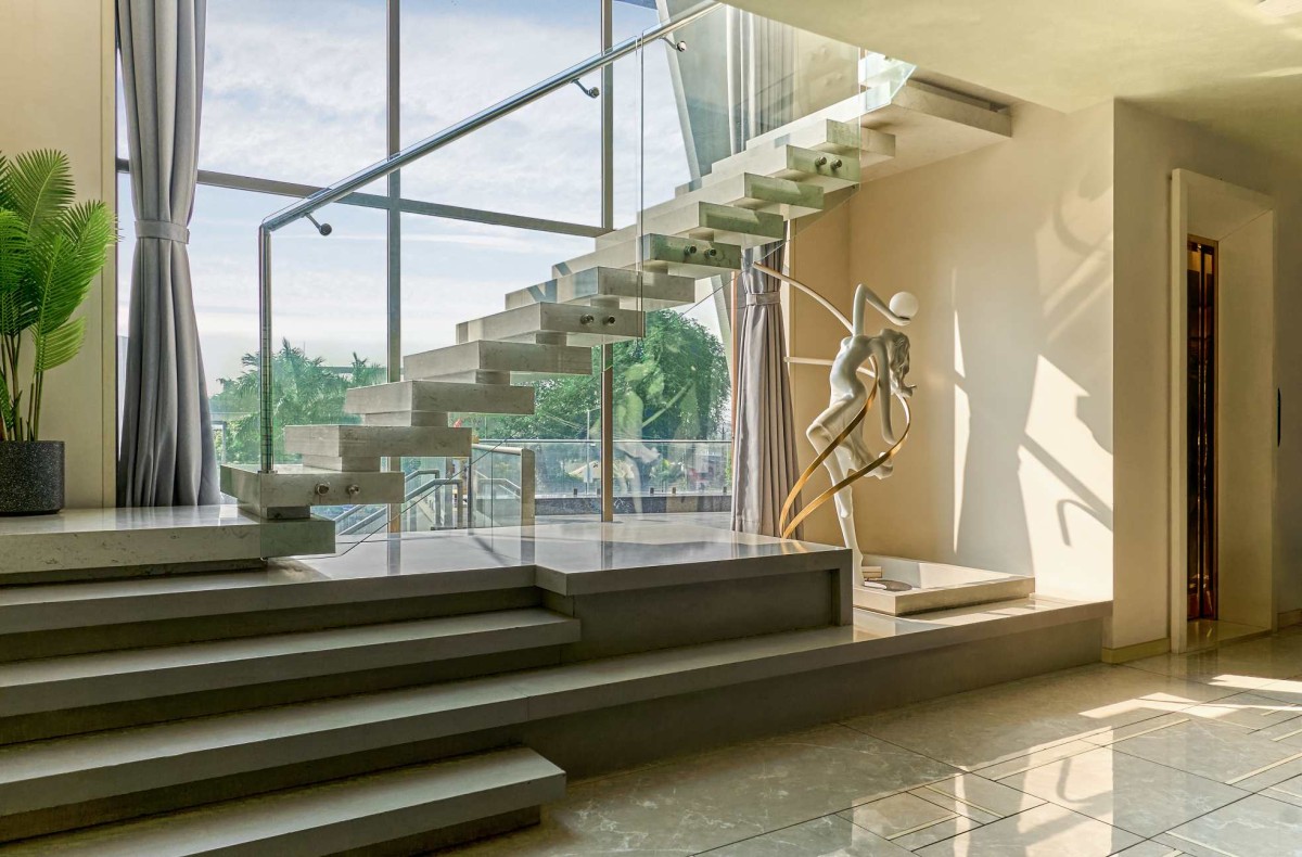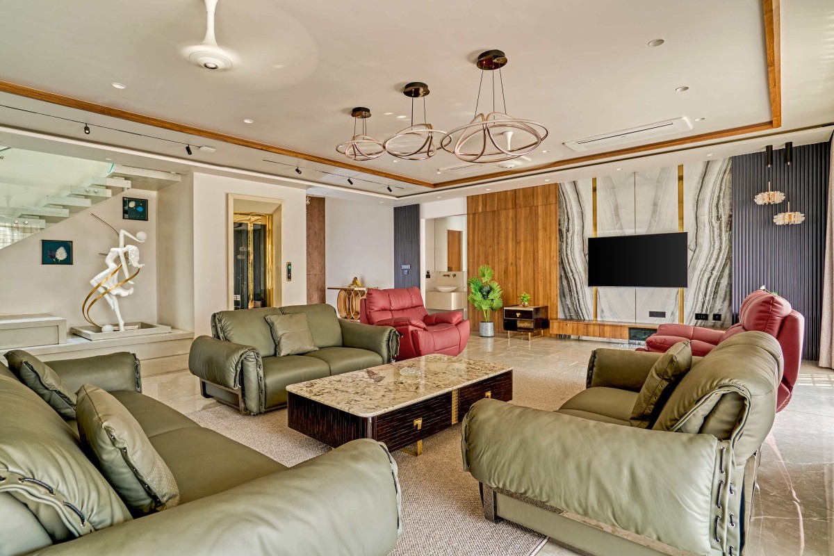 The design process began with decoding the triangular site and its Vastu constraints, testing multiple massing and circulation options to align functional zones with auspicious orientations. The team worked to separate vehicular and pedestrian flows, carving out private parking, guest parking, and landscape pockets that rationalize the irregular plot. Internally, functions were layered vertically: shared lifestyle and service zones at ground, individual family domains at upper levels. Iterations focused on how to retain parity between the two homes while avoiding a “mirror-copy” feel. The double-height floating staircase and common entrance terrace emerged as key devices to bind the house volumetrically, while customized interior layouts for each brother ensured privacy and identity.