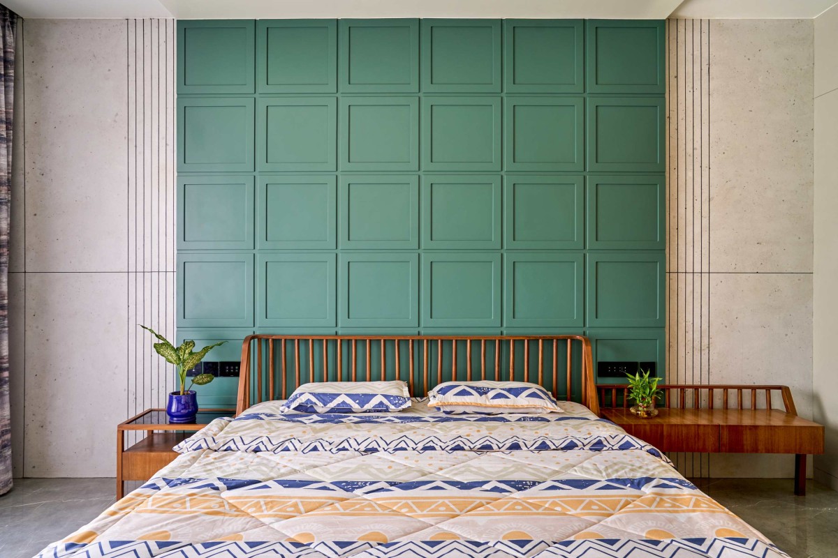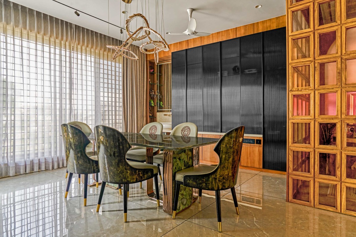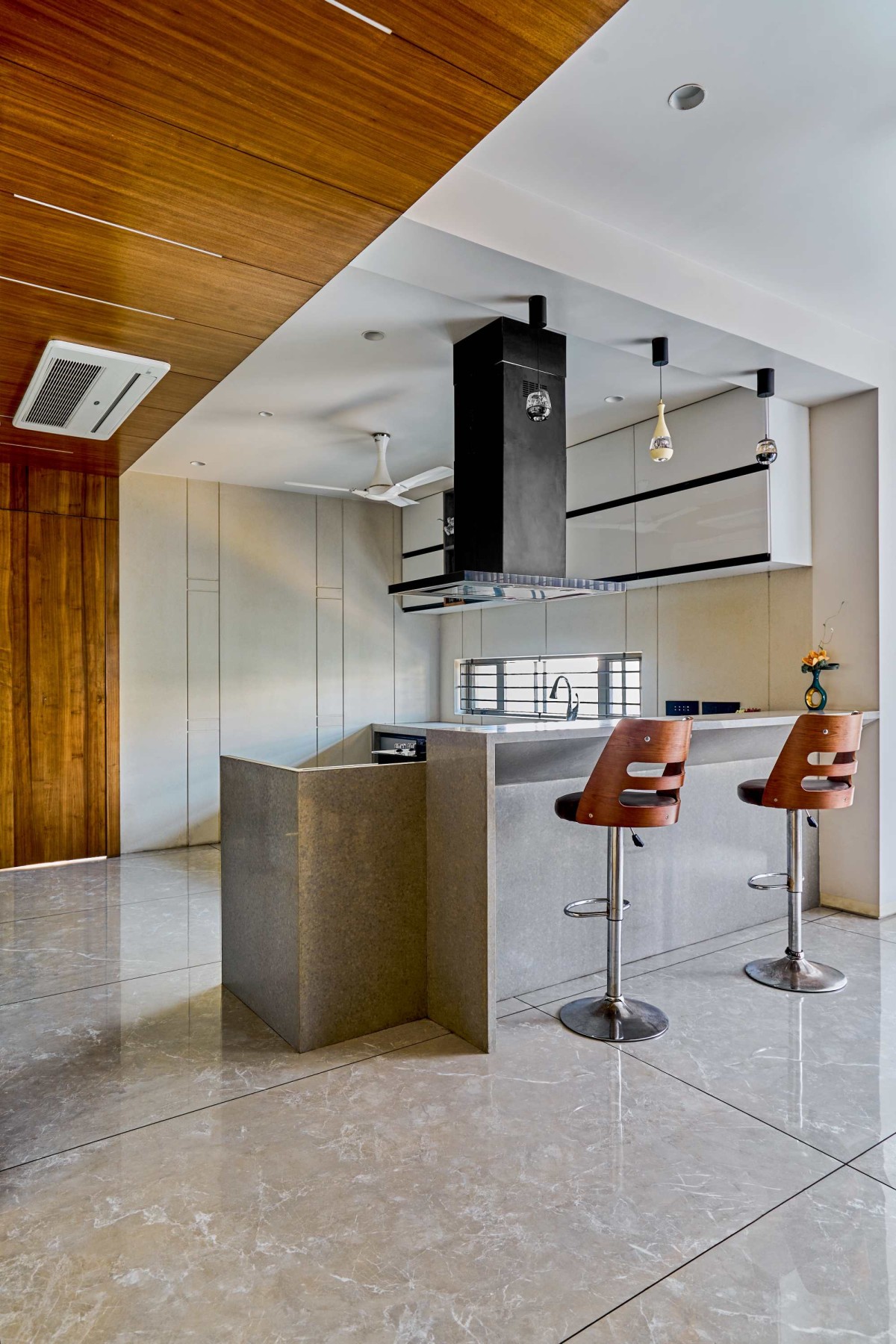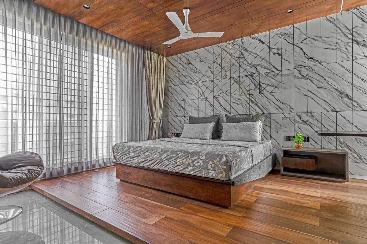 The design process began with decoding the triangular site and its Vastu constraints, testing multiple massing and circulation options to align functional zones with auspicious orientations. The team worked to separate vehicular and pedestrian flows, carving out private parking, guest parking, and landscape pockets that rationalize the irregular plot. Internally, functions were layered vertically: shared lifestyle and service zones at ground, individual family domains at upper levels. Iterations focused on how to retain parity between the two homes while avoiding a “mirror-copy” feel. The double-height floating staircase and common entrance terrace emerged as key devices to bind the house volumetrically, while customized interior layouts for each brother ensured privacy and identity.