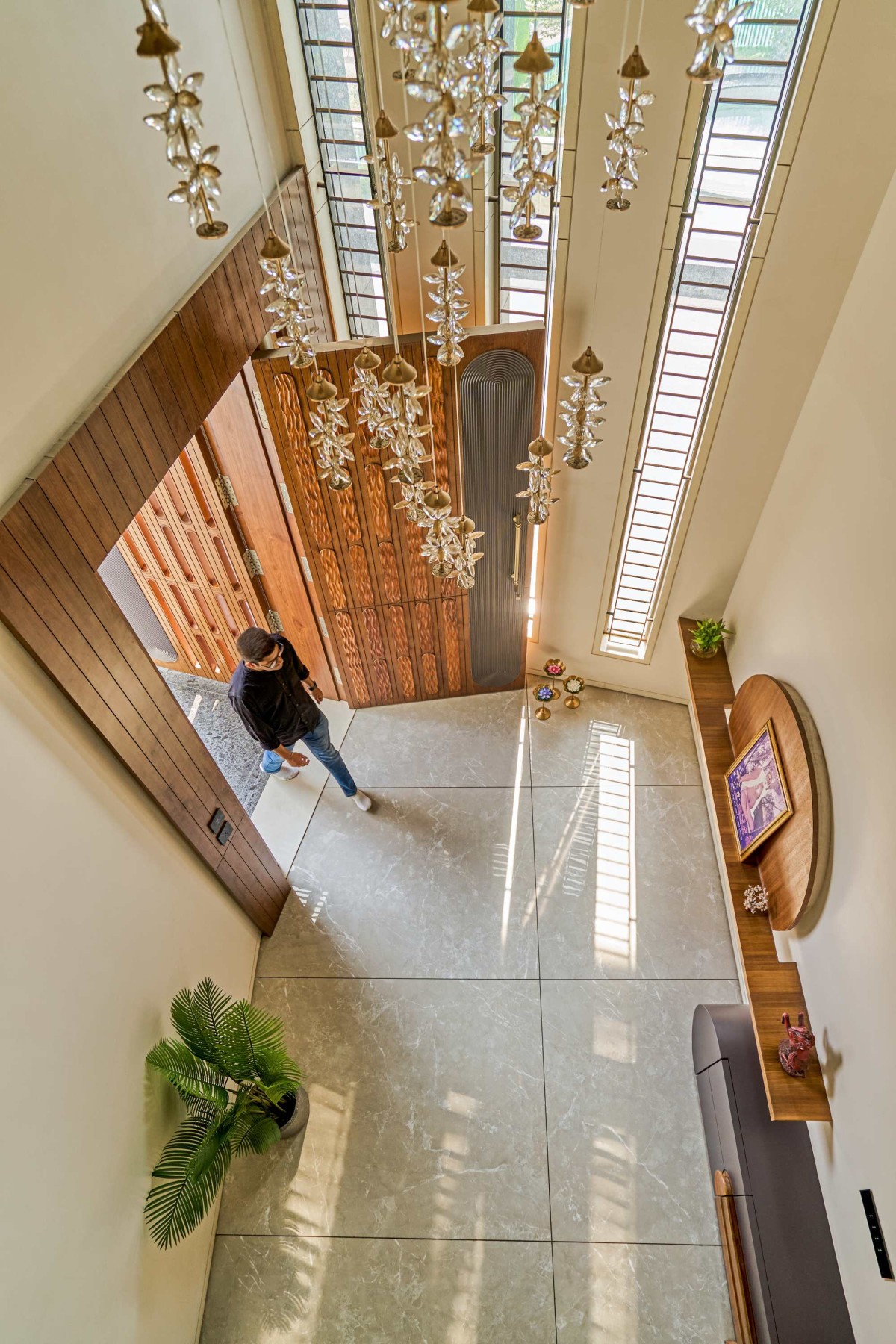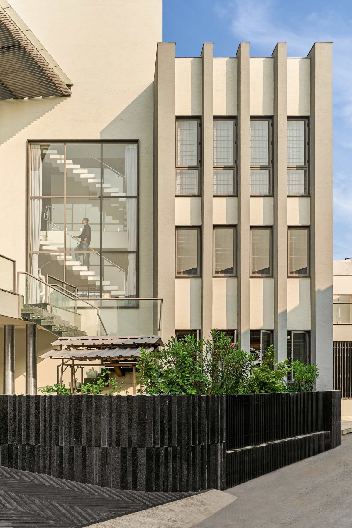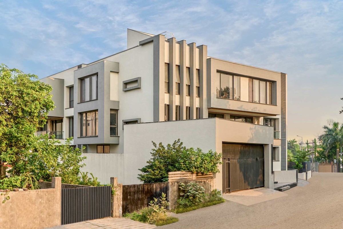 Shraddha is conceived as “one home, two hearts” – a single, bold bungalow form quietly holding two complete family homes within. The triangular corner plot, often seen as problematic in both architecture and Vastu, becomes the generating device for a dynamic yet disciplined form. Externally, the house reads as a unified, contemporary residence; internally, it carefully negotiates togetherness and independence. A common arrival layer with shared amenities anchors the ground, while the first and second floors unfold into individualized family suites. The double-height volume and floating stair act as a spatial hinge, bringing light and continuity. The architecture aspires to move beyond the idea of “divided property” and instead celebrates a shared legacy, offering crafted, Vastu-aligned, climate-responsive spaces that are simultaneously personal, familial, and urban in their expression.