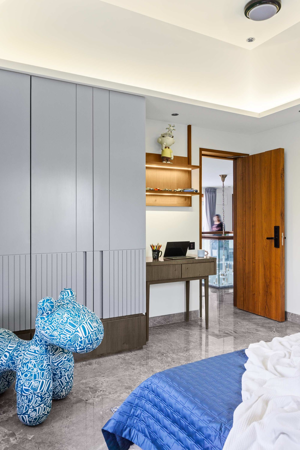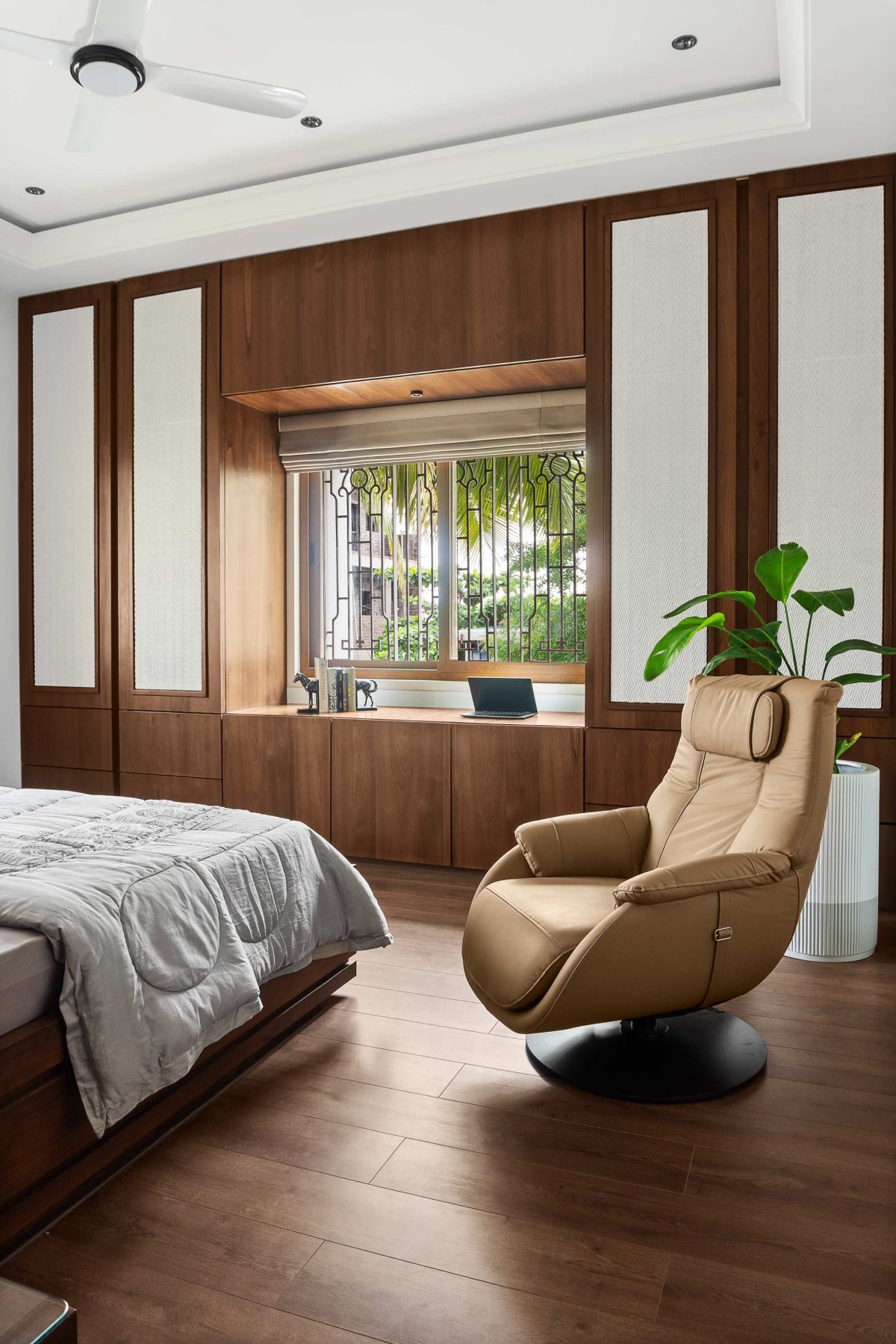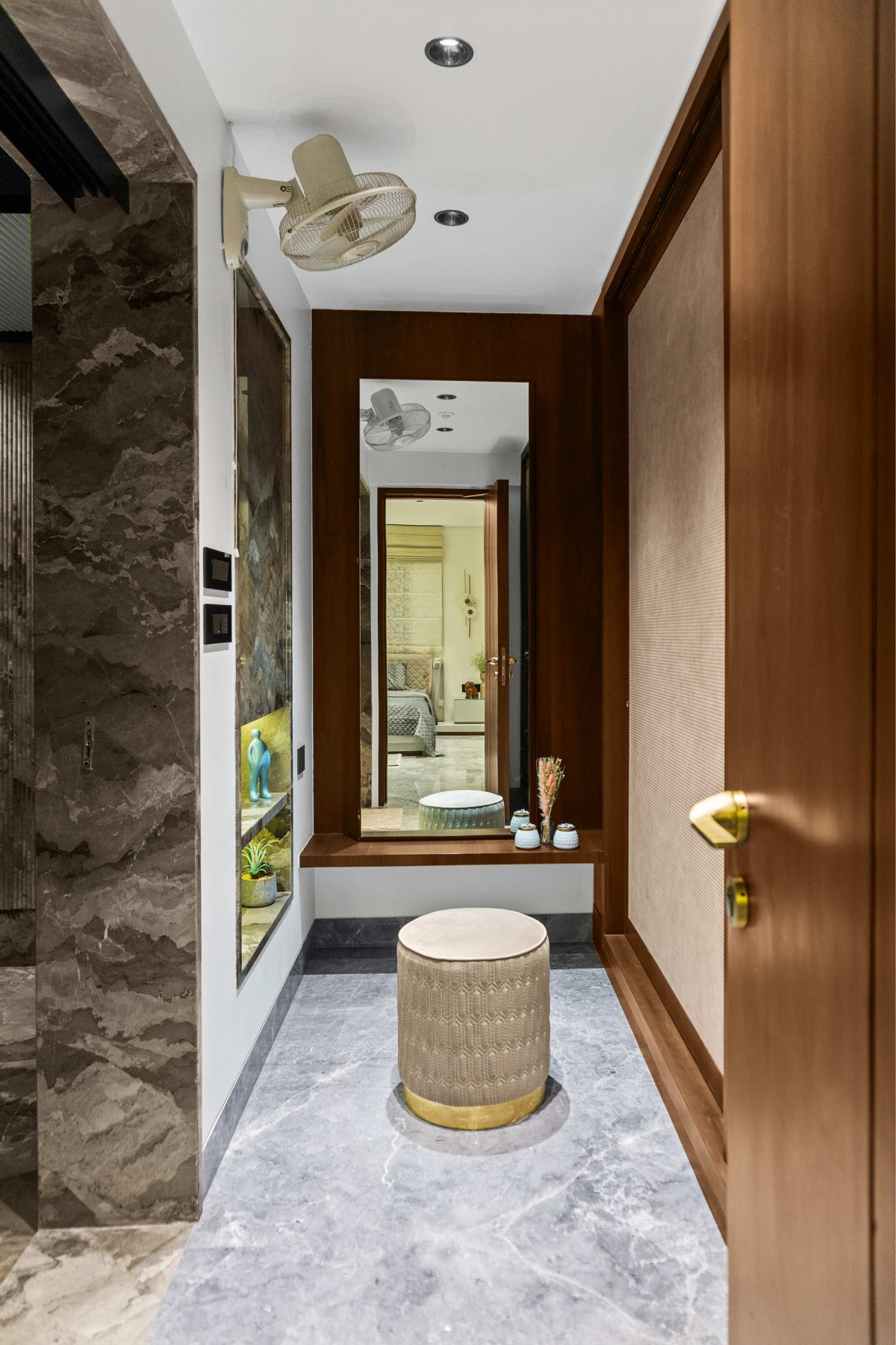 On the first floor, three personalized bedrooms unfold, each designed as a private sanctuary for its occupant. While distinct in material and tone, they’re united in their quiet luxury. A shared home theatre becomes a communal pause point where generations meet not just in movie nights, but in shared memories.