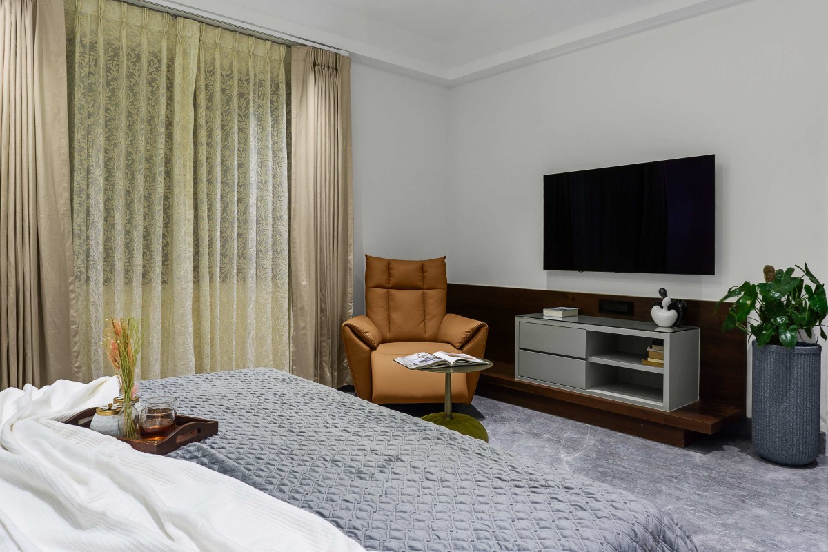 To the right, the living room bathes in gentle natural light streaming in through expansive windows. It’s a space where moments are both shared and savored, crowned by a sculptural white chandelier that hangs like a floating cloud, quiet yet impactful. The design strikes a delicate balance between communal warmth and serene quietude, making it a room where the family comes together, but also finds stillness.