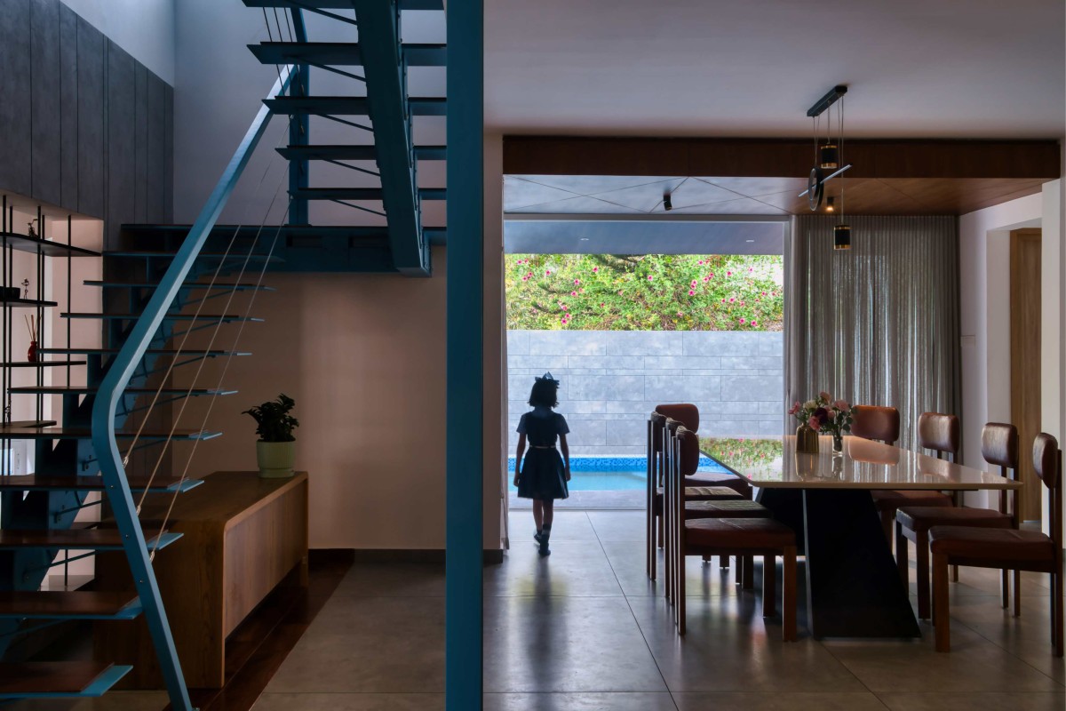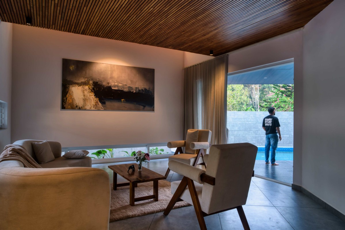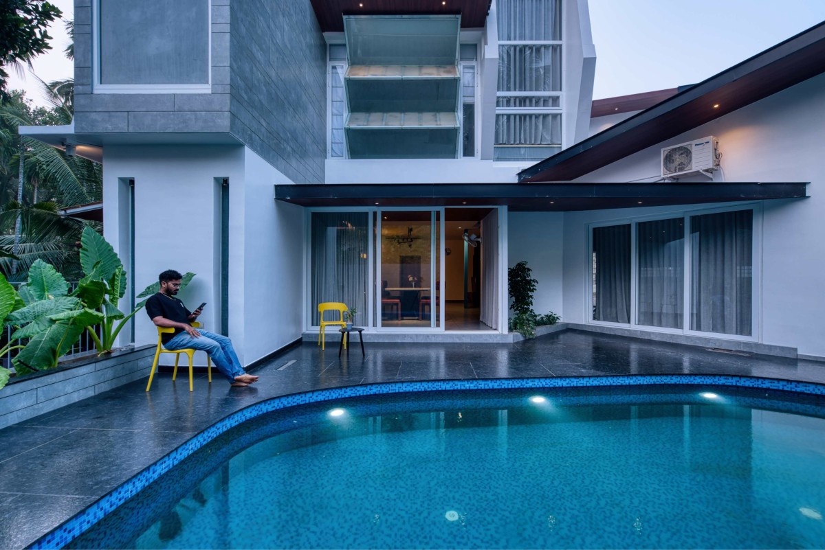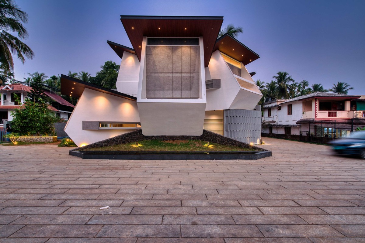 The skewed, sculptural massing acts as a privacy shield from the public edge while shaping light, views, and airflow. The roof is designed as an active architectural element, collecting rainwater and directing it into a rainwater harvesting and recharge system, responding sensitively to the Kerala climate. Internal courtyards and controlled openings ensure thermal comfort and daylight without exposure, reinforcing a contemporary tropical approach.This project demonstrates how adaptive reuse, sculpture, and climate-responsive design can coexist to create a bold yet grounded home.
