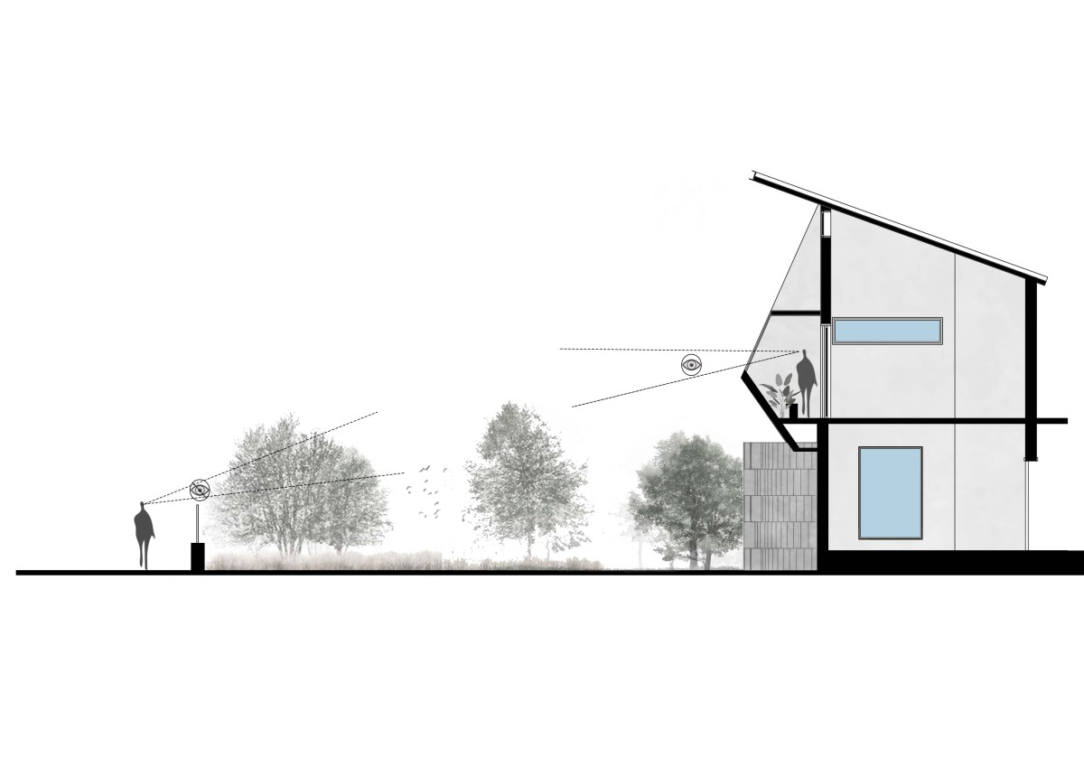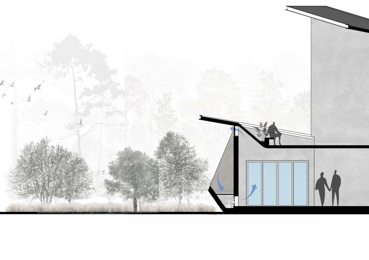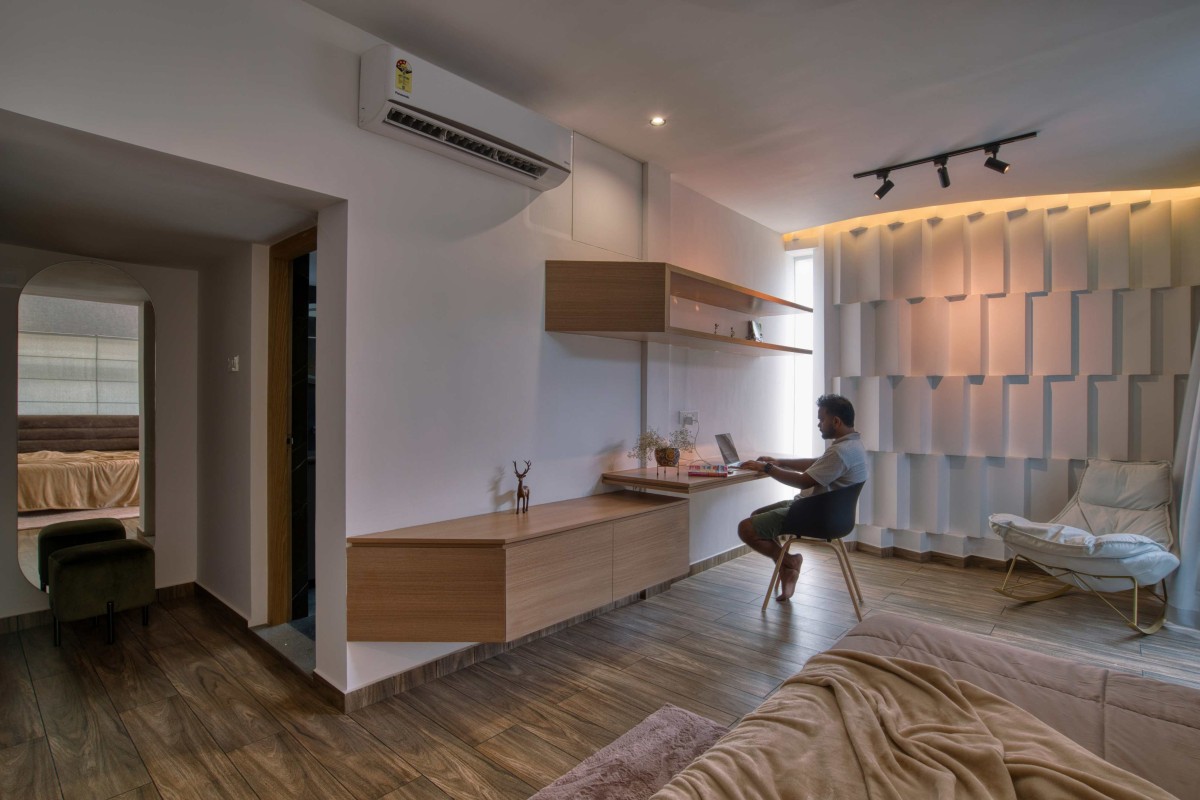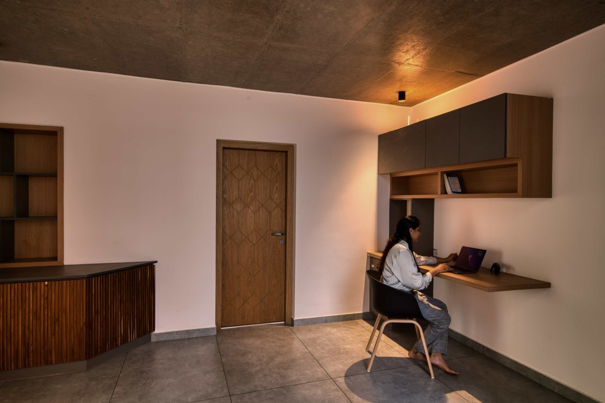 The skewed, sculptural massing acts as a privacy shield from the public edge while shaping light, views, and airflow. The roof is designed as an active architectural element, collecting rainwater and directing it into a rainwater harvesting and recharge system, responding sensitively to the Kerala climate. Internal courtyards and controlled openings ensure thermal comfort and daylight without exposure, reinforcing a contemporary tropical approach.This project demonstrates how adaptive reuse, sculpture, and climate-responsive design can coexist to create a bold yet grounded home.