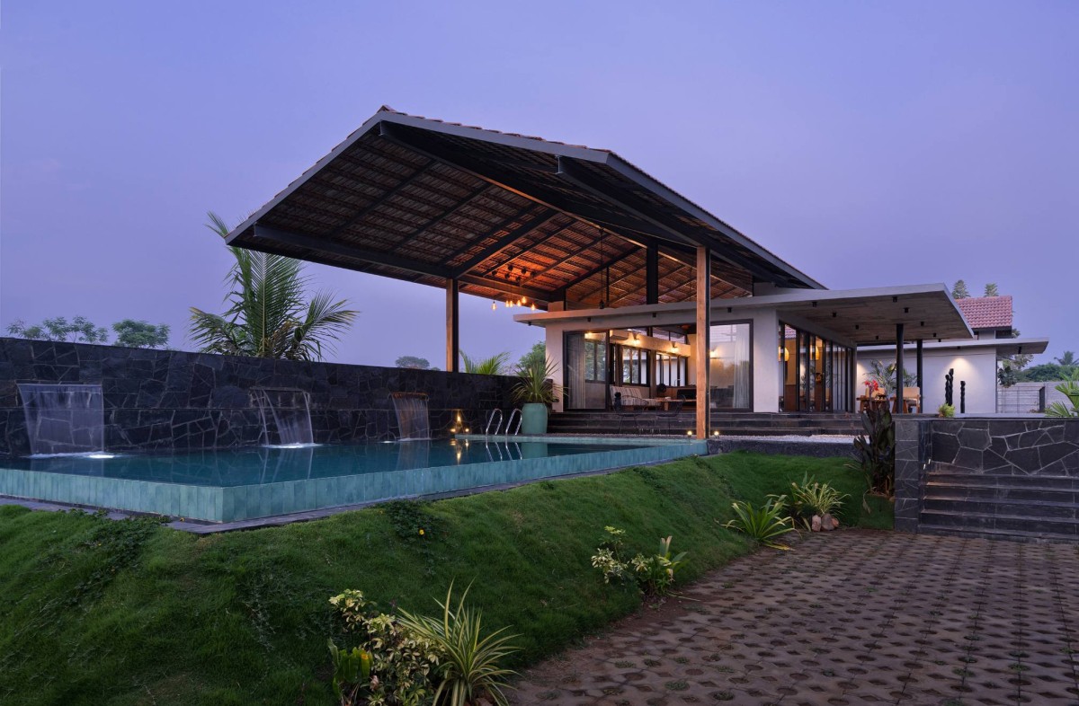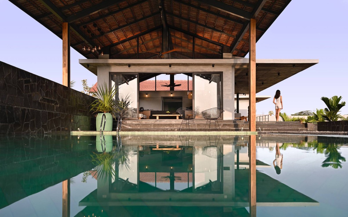 The desire for a connection to place and an earth-sensitive lifestyle shaped the built-form, the programmatic orchestration as well as the materiality. They imagined the envelope as a light, porous structure that would soften the distinction between a manmade object and its picturesque natural environs. Promoting togetherness and interaction, the configuration lays emphasis on common areas. The seamless sprawl of the east-facing public zone — comprising the pool deck, living area and kitchen — is replete with light and air, thanks to the extensive glazing, making mornings especially beautiful. Deep overhangs and canopies, supported on slim columns, create cool, shaded spaces that are also sheltered from tropical downpours. While these functionalities are bound by singularity of volume, they also enjoy distinct personalities owing to a tasteful deployment of furniture, art and other accessories. The bedrooms are tucked away to the west, beyond a small corridor, and protected from the harsh west sun by a blank wall.