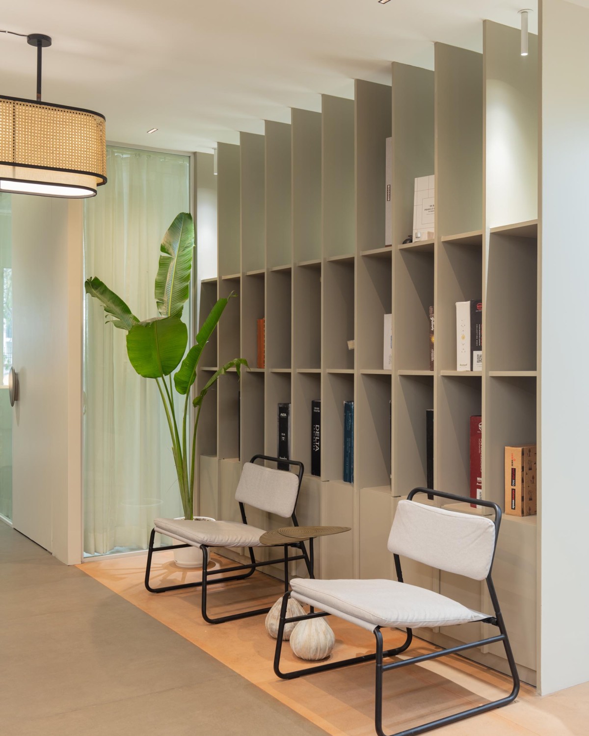 A restrained palette of warm neutrals anchors the interior, allowing texture to take precedence over color. Cane, wood, stone, fabric, and muted metal finishes are layered thoughtfully, resulting in a space that feels both contemporary and timeless. Lighting plays a crucial role—not as a decorative afterthought, but as an architectural element that shapes mood and rhythm throughout the day. Diffused, warm light softens surfaces, reinforcing the studio’s residential character.