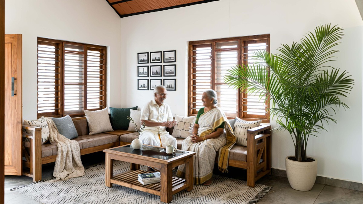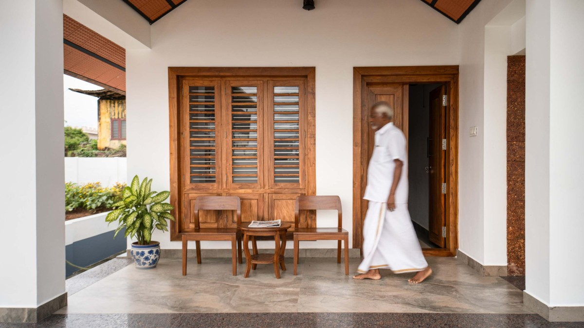 Spaces unfold in a rhythm shaped by climate and culture. Verandahs dissolve the threshold between inside and out, inviting breezes through the home and framing calibrated views of the surrounding green. Sunlight enters gently, tracing the grain of teak and revealing the natural textures that animate the interior envelope. The plan encourages slow transitions and quiet pauses, embodying a spatial ethos rooted in comfort, openness, and mindful living.