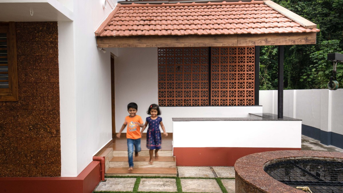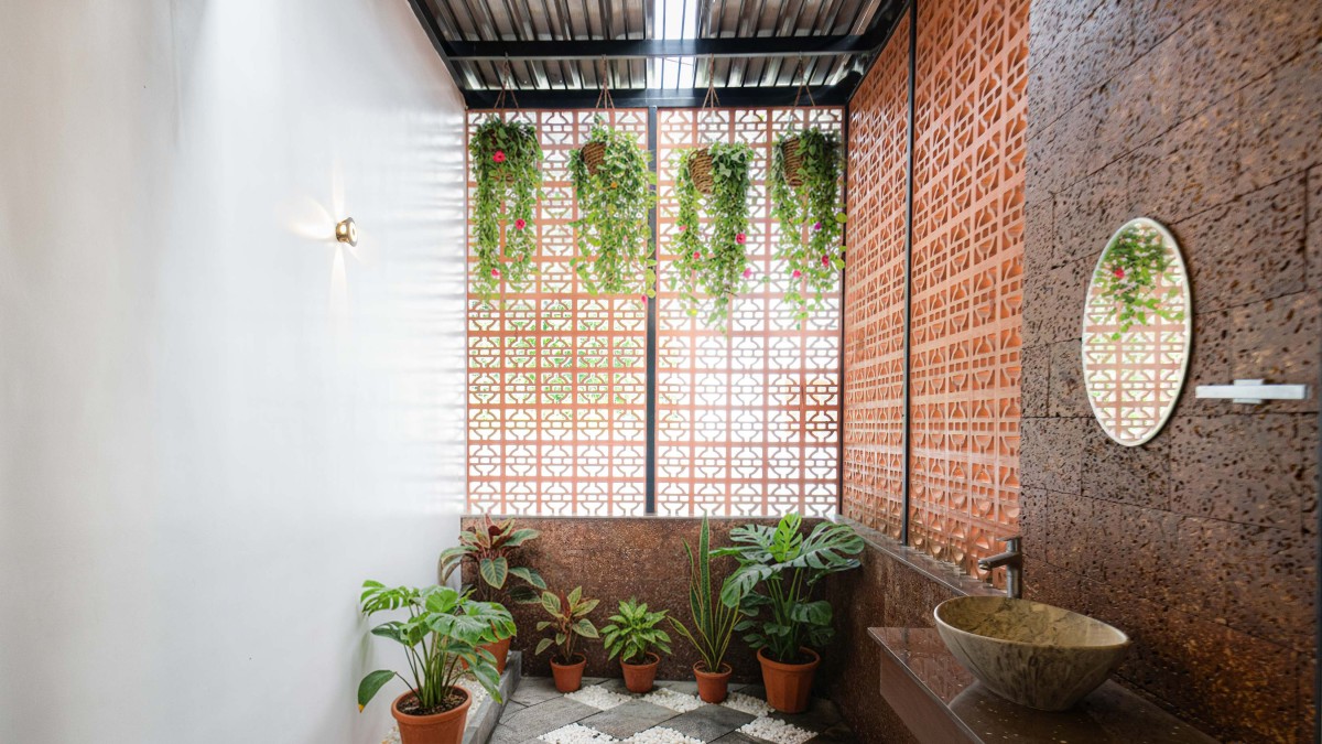 Located in the serene landscape of Palakkad, Swasti positions itself as a study in balance: between earth and air, mass and void, craft and geometry. Its familiar pitched roofs and terracotta accents echo the silhouettes of Kerala’s vernacular dwellings, while the clean, restrained lines of its built form convey a modern sensibility. The architecture resists ornamentation, instead celebrating the tactile honesty of wood, clay, stone, and lime-washed surfaces — materials that are at once ancient and enduring.