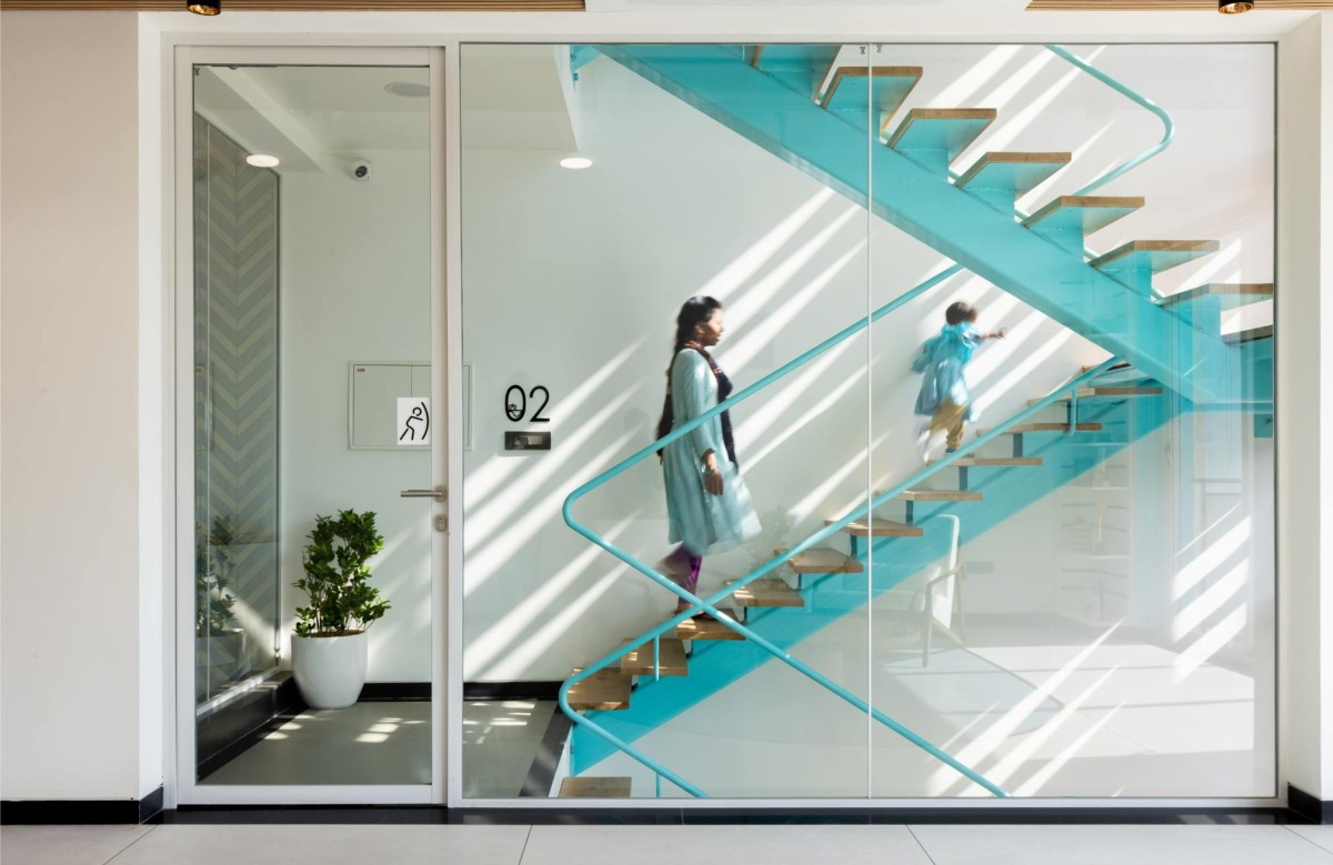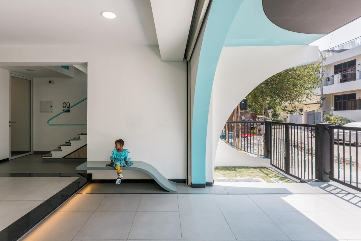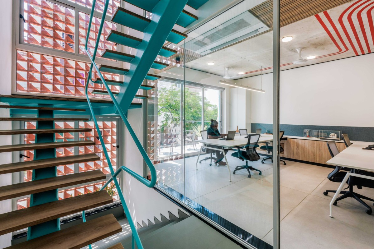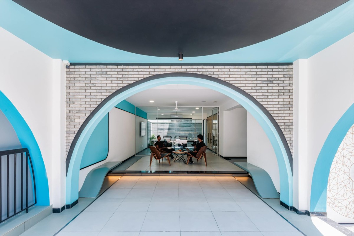 The combination of materials like concrete, steel, glass and clay are harmoniously blended to put in to their best use. The architect who loves to play with colors have chosen Cyan as the color for his building and have explored the various shades and combinations of cyan to give an artistic imprint to the building. Various geometric forms of squares, rectangles, arches and triangles have been explored in the design, yet to bring in a balance, rhythm and unity. Reinstating his beliefs, this material palette along with the forms and colors create a visual melody, and thus a symphony.