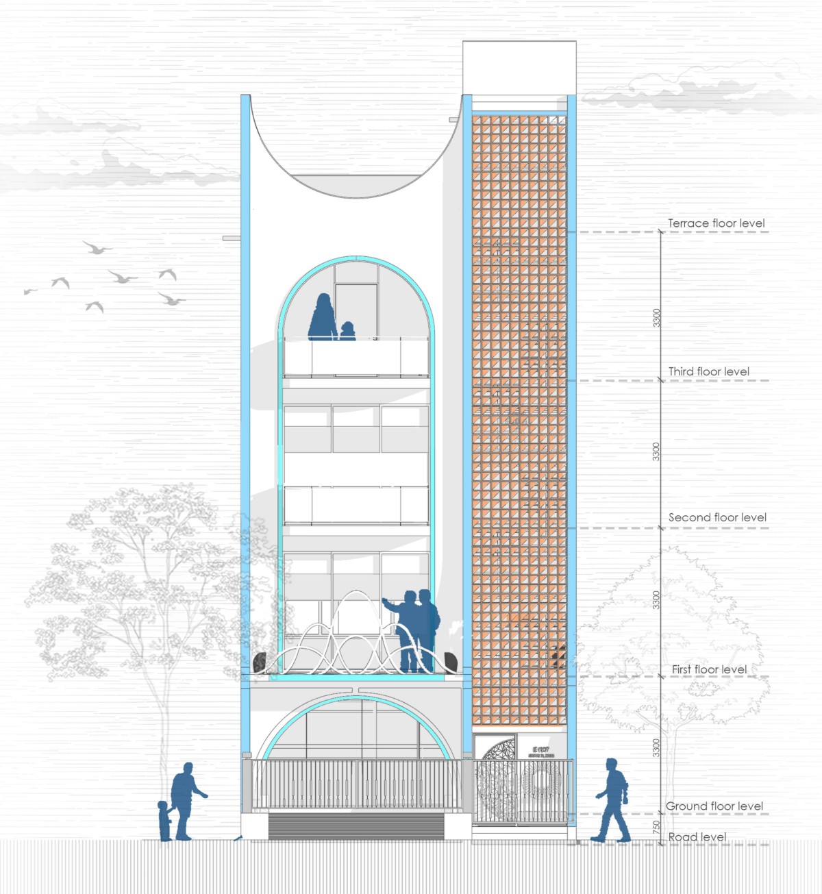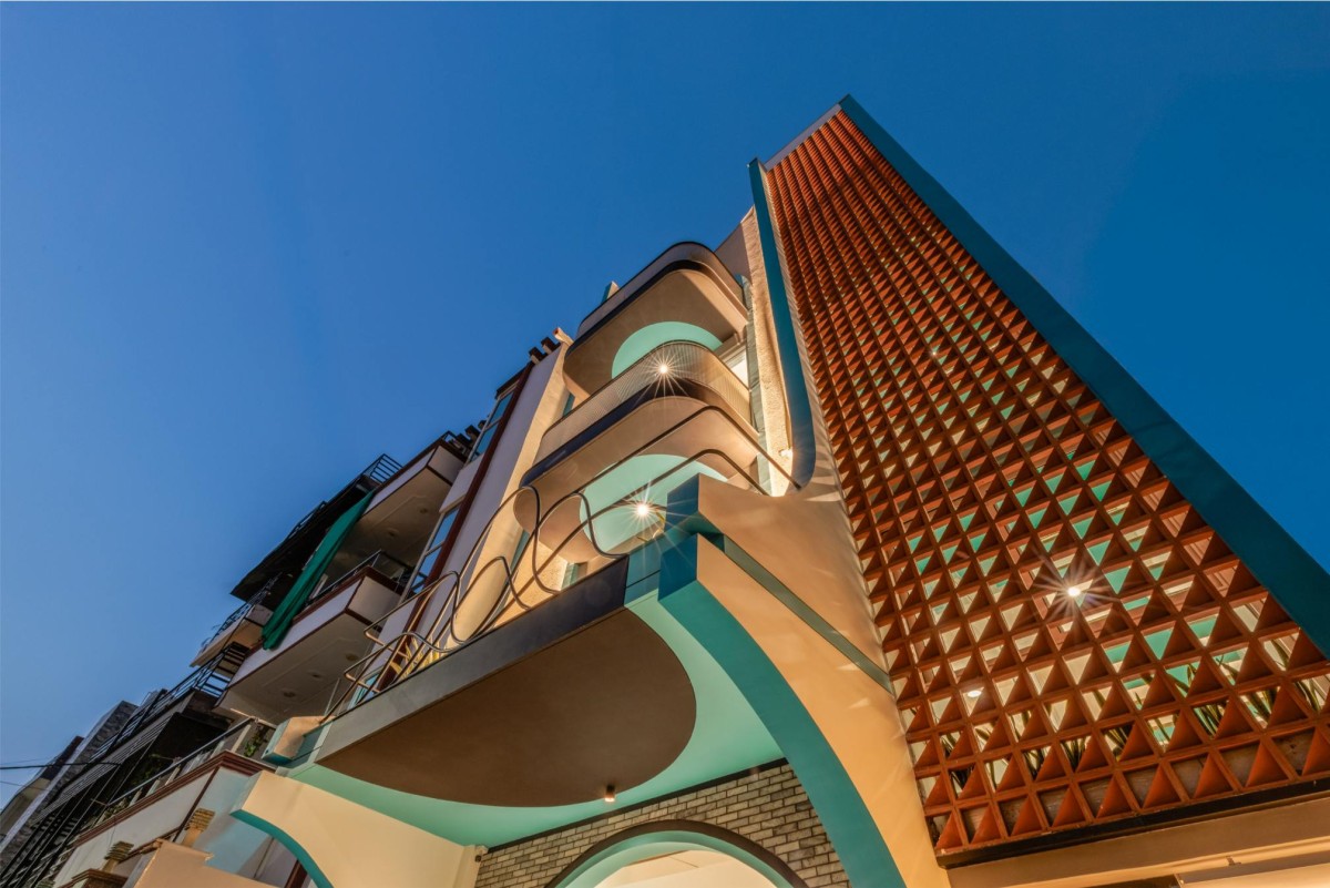 Curved profiles, rhythmic balcony lines, and the punctuated screen wall together create a fluid narrative — one that resonates with both movement and pause, echoing the cadence of music. The gentle sweep of the edges and the flowing metalwork further add different layers to reinforce this abstract musicality, allowing the elevation to transcend utility and evoke an emotion of melody.