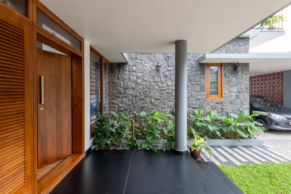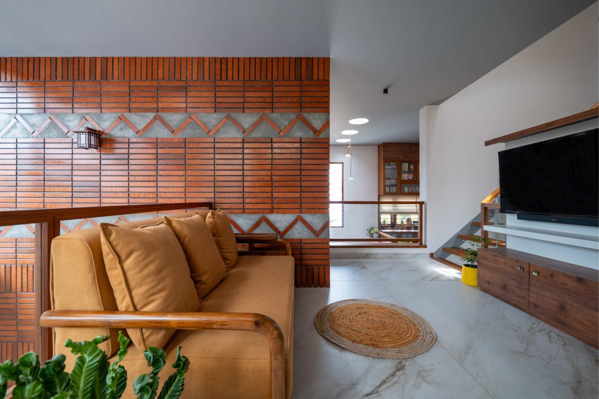 The exterior of the residence reflects a thoughtful balance between modesty and functionality, designed as a two-storey home with three bedrooms efficiently accommodated within an 8-cent plot. Prioritizing authenticity and warmth, the design employs natural materials such as brick, wood, and stone. A welcoming entryway enhances the sense of arrival, featuring a cozy front porch, a garden with benches, and a sit-out that encourages interaction with visitors. In keeping with principles of responsible living, the home also incorporates sustainable features including solar panels, a rainwater harvesting system, and native landscaping.