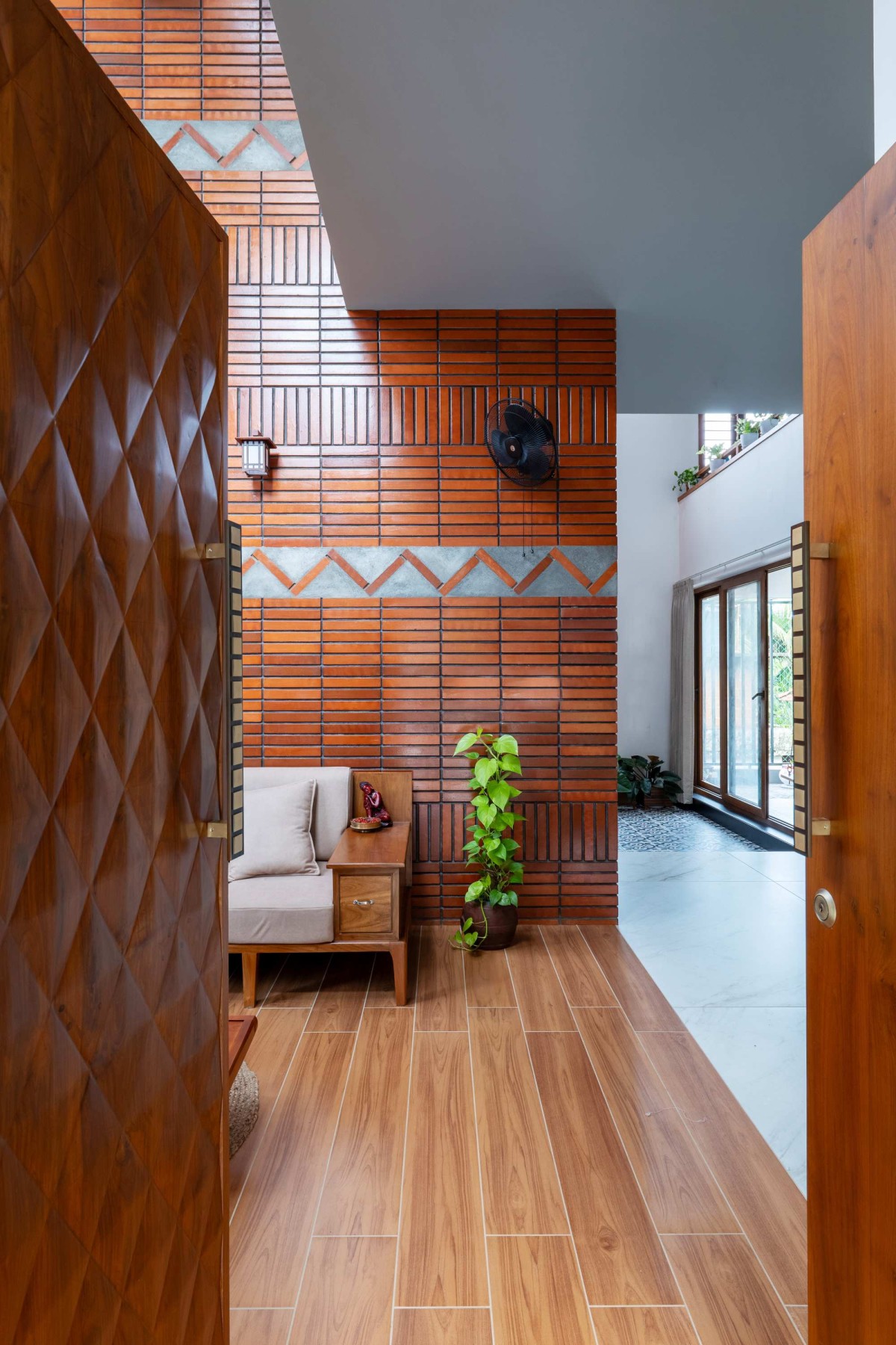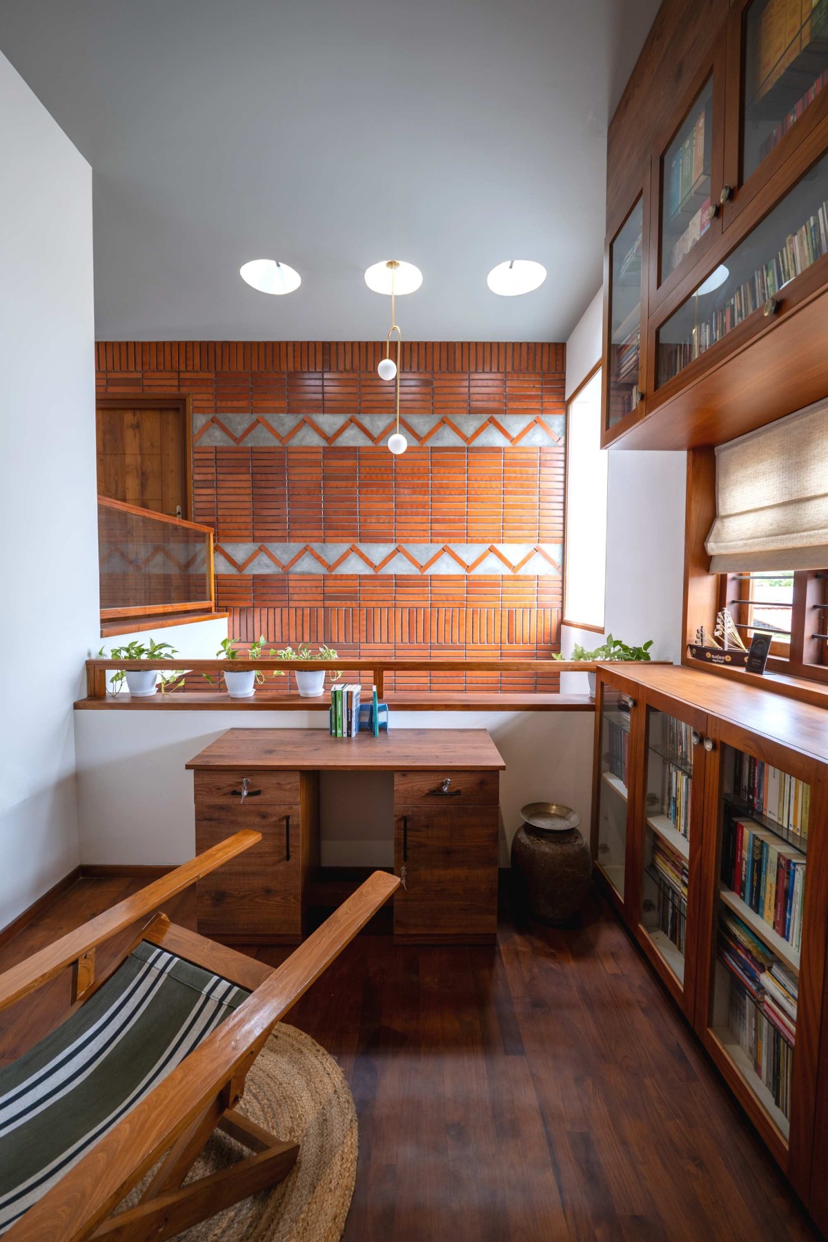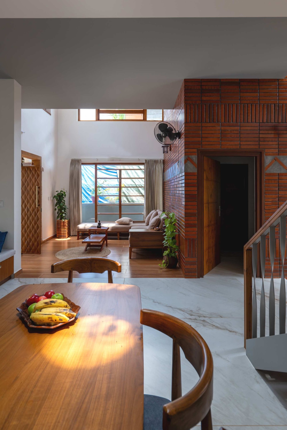 The home is designed to encourage both contemplation and learning through a series of carefully crafted spatial elements. At the stair mid-landing, a "Mini Library" is introduced—a wall lined with books, teaching materials, and journals—opening out to the internal courtyard and enriching the daily rhythm of the house. A dramatic "double-height wall", rising six meters, is animated with clay brick patterns that connect the ground and first floors, inviting moments of pause as natural sunlight filters in from the skylight above, with each brick carrying its own distinct character of tone and shade.