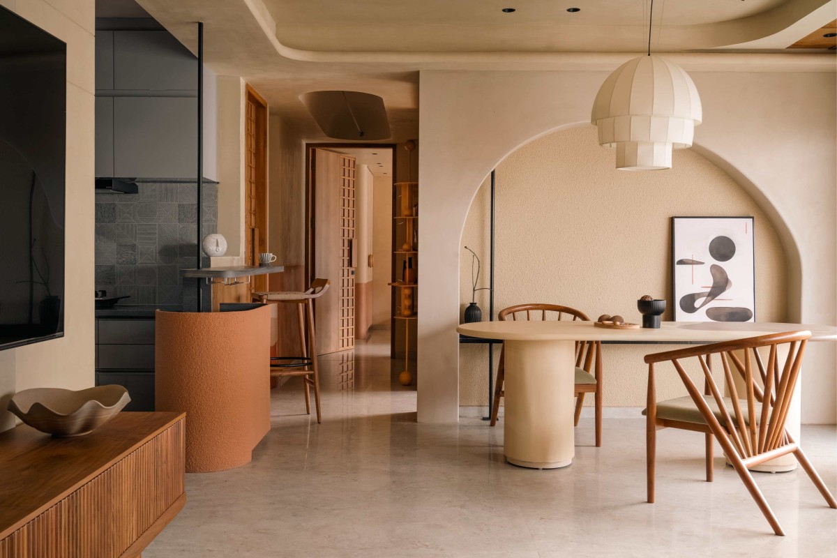 The dining area, conceived as a serene extension of the living space- creates a moment of pause with an arched architectural backdrop that introduces rhythm and softness. A terracotta-finished bar table acts as a transitional element between the dining and kitchen areas, balancing functionality with material expression —a bold element that segregates the zones while maintaining visual continuity.