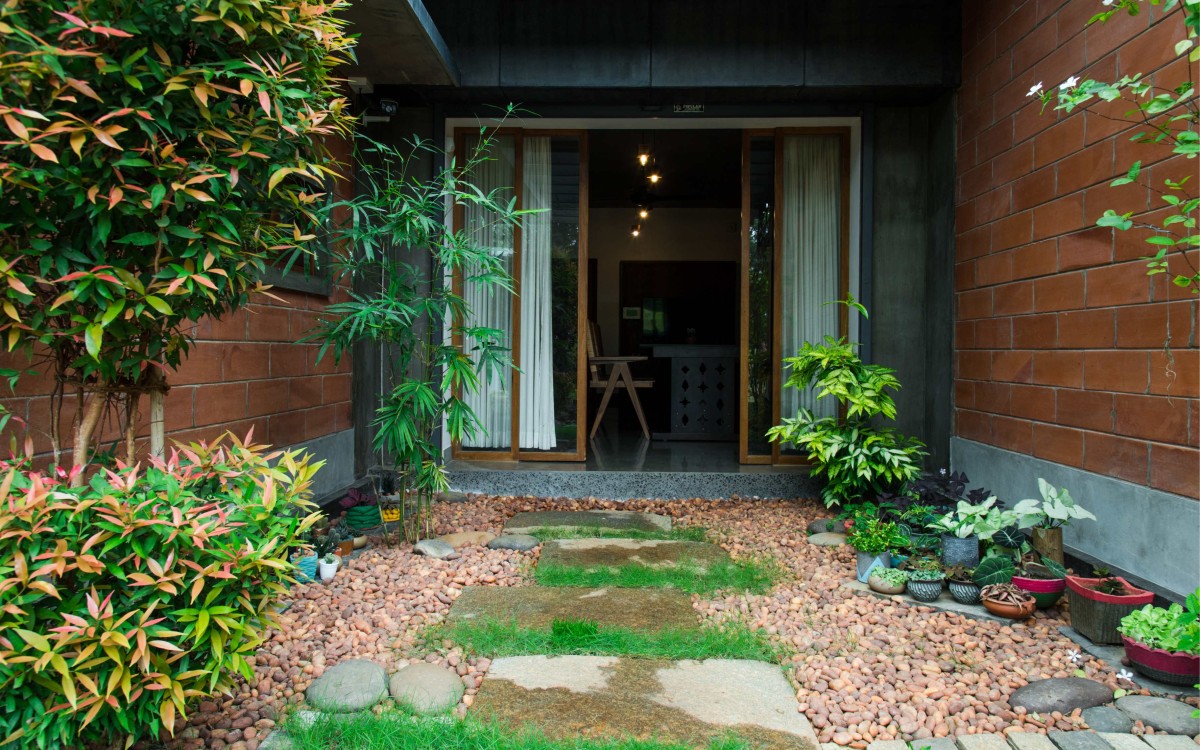 The ingenious planning involved unfolding the design from the landscape with a small winding road leading to the car park beside the house and for pedestrians: a series of steps landscaped with the existing levels, resulting in a residence that looks immersed in nature. Further, accommodating adequate transitional spaces that enhance the flow of indoor-outdoor spaces, and an interesting interplay of built volumes that aids in interspersing natural light to every corner of the house ensured a holistic nature-integrated spatial experience.