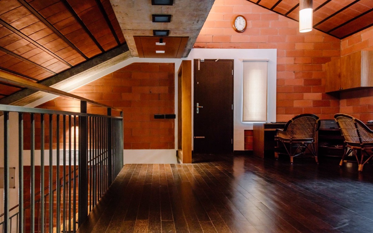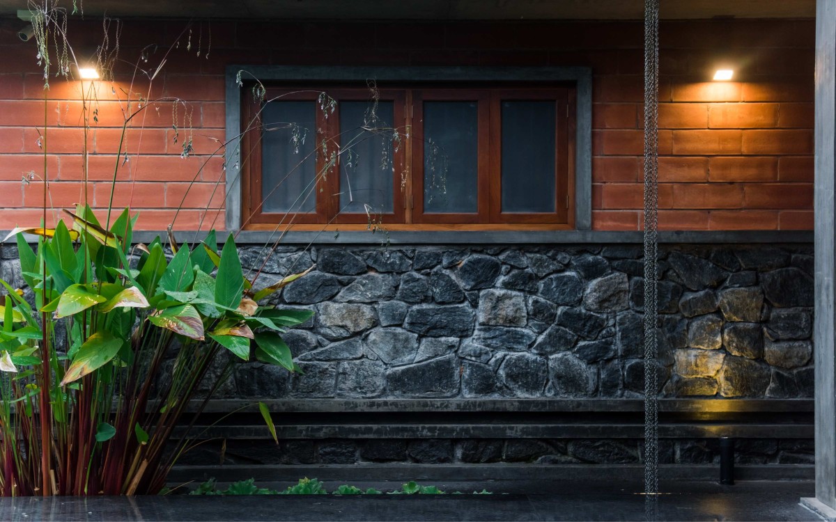 The home interiors draw inspiration from rich traditional Kerala houses lending the feel of dark yet well-lit spaces. This gets accomplished through louvered windows, small punctures on the roof, and strategically placed openings that also aid in passive cooling.