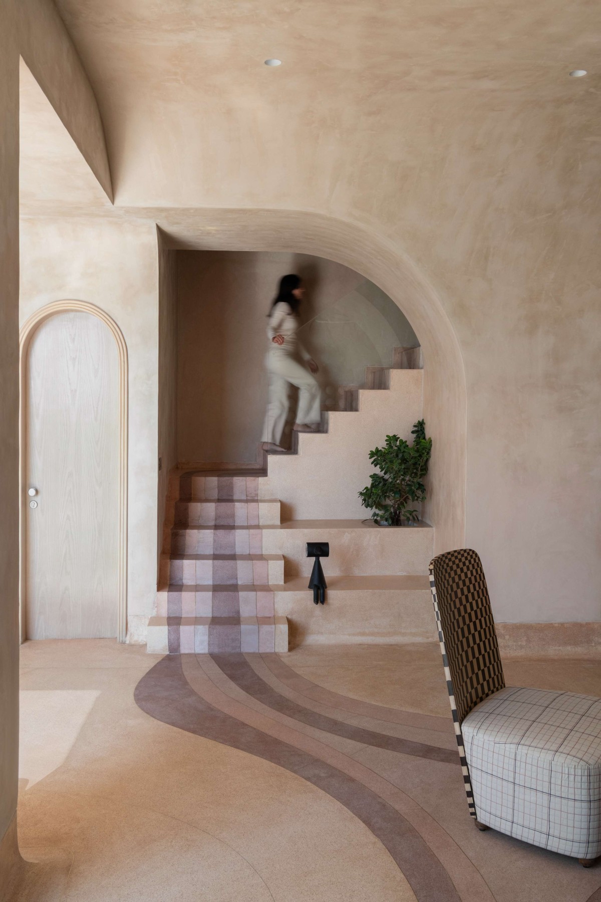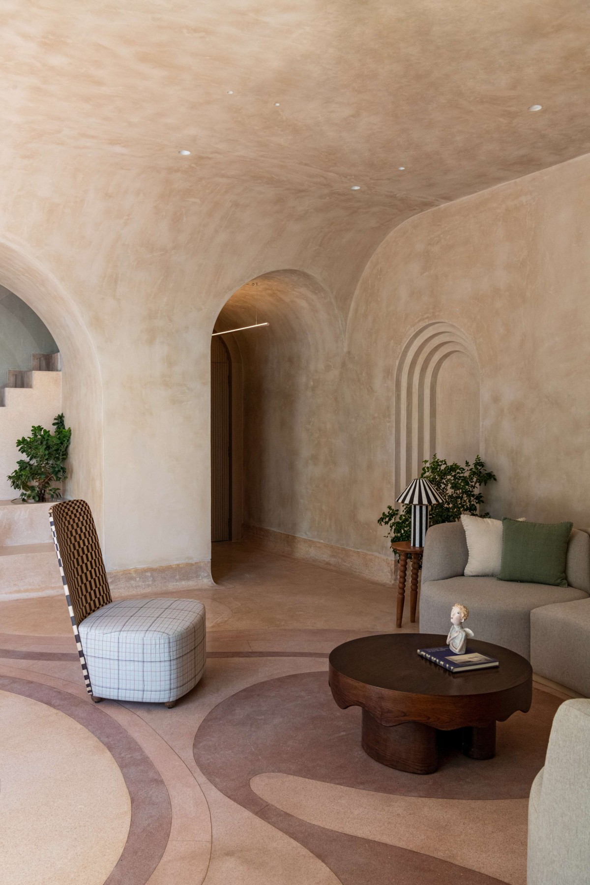 Curved walls and arches soften transitions, instilling a sense of movement throughout the space. The terrace acts as an extension of the living area, complete with driftwood-style wooden flooring and dedicated al fresco dining spaces, effectively blurring the boundaries between inside and outside.