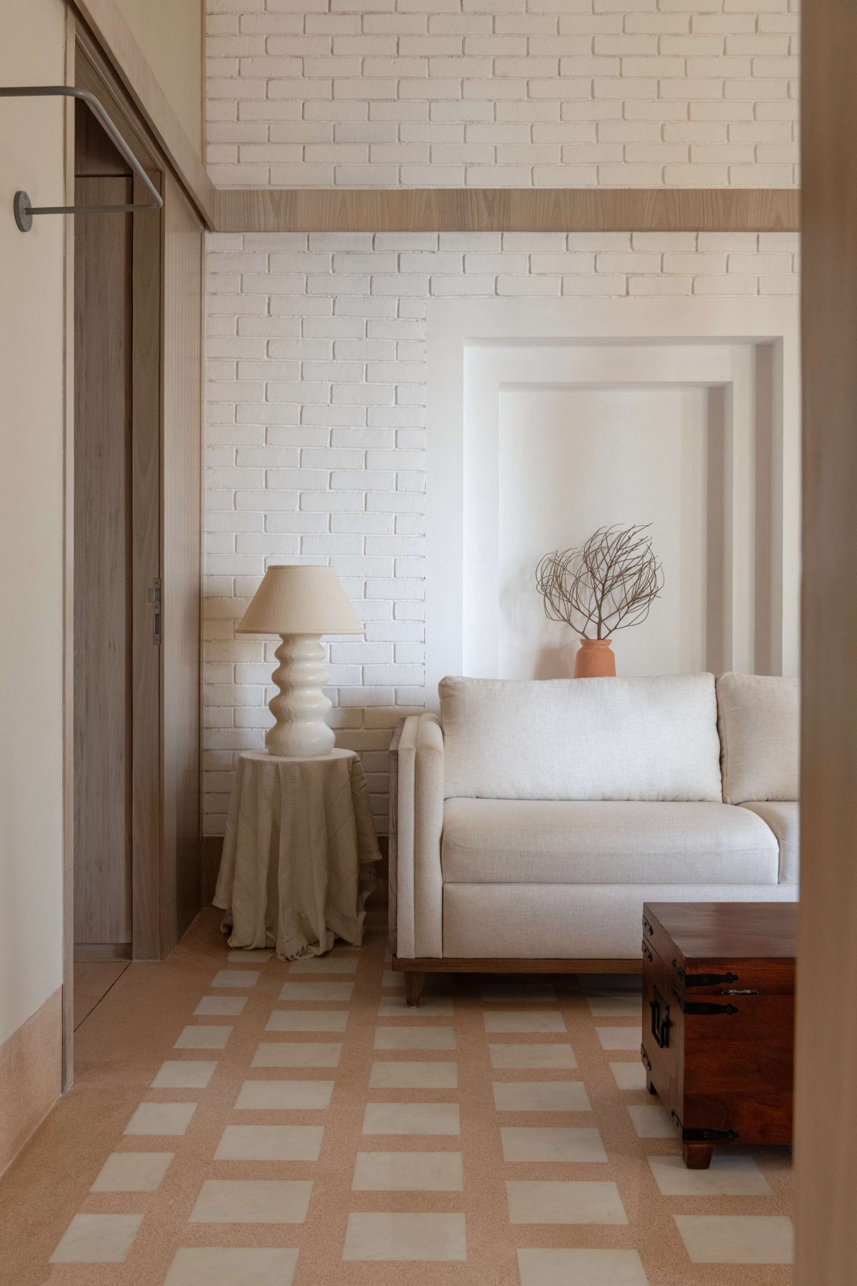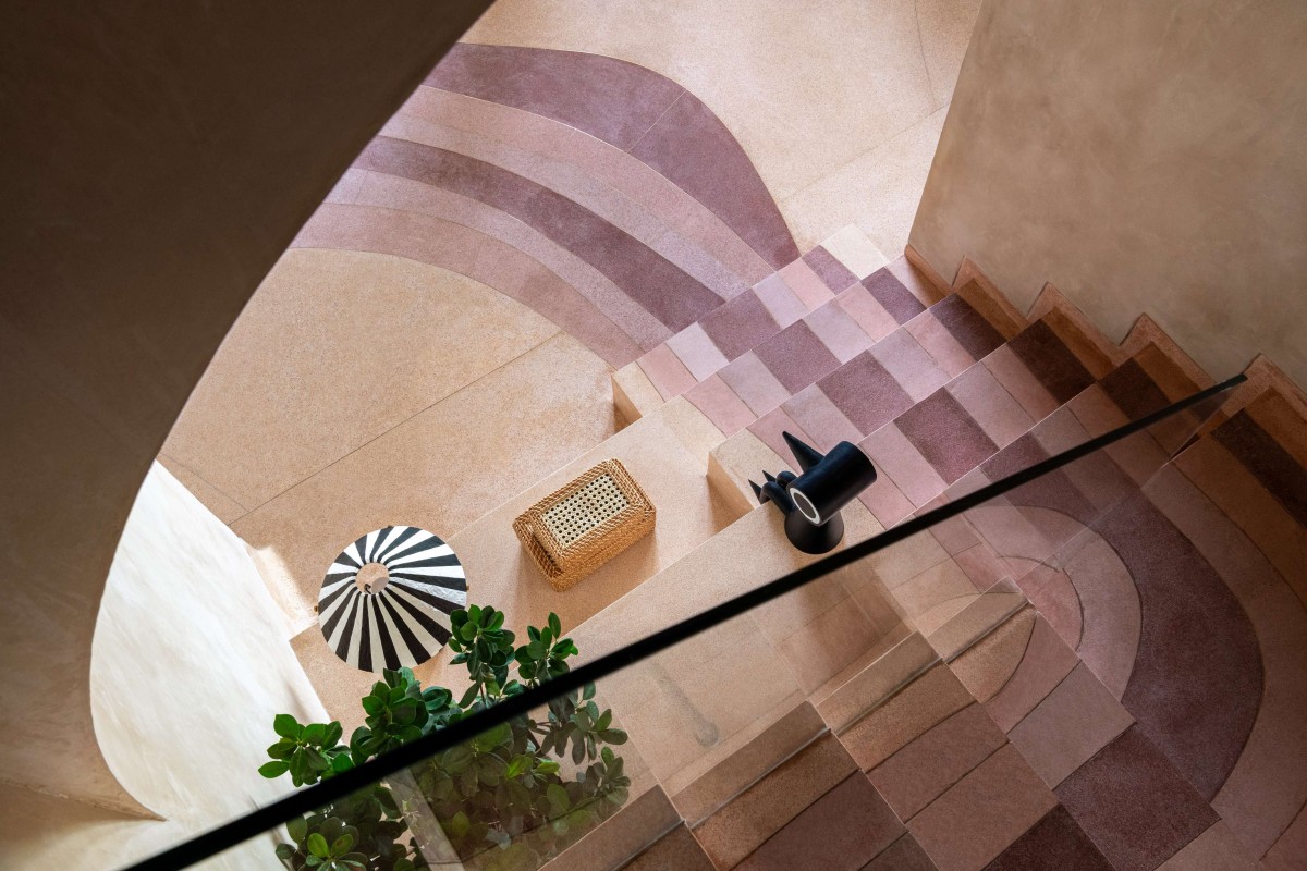 Functional and stylish interiors were paramount, particularly considering the active lifestyle of the family. The choice of in-situ terrazzo flooring not only meets the practical needs of the homeowners but also enhances aesthetic appeal. The living room features playful, wavy edged furniture that echoes the design ethos, while the kids' bedroom includes a raised platform for play, further reflecting the family’s dynamic needs. Each room is tailored to enhance comfort and functionality, with the master bedroom showcasing a symmetric arched bed back wall inspired by Indian art, creating a serene focal point. A multipurpose room accommodates a work desk and a flexible bed setup, catering to various family requirements.