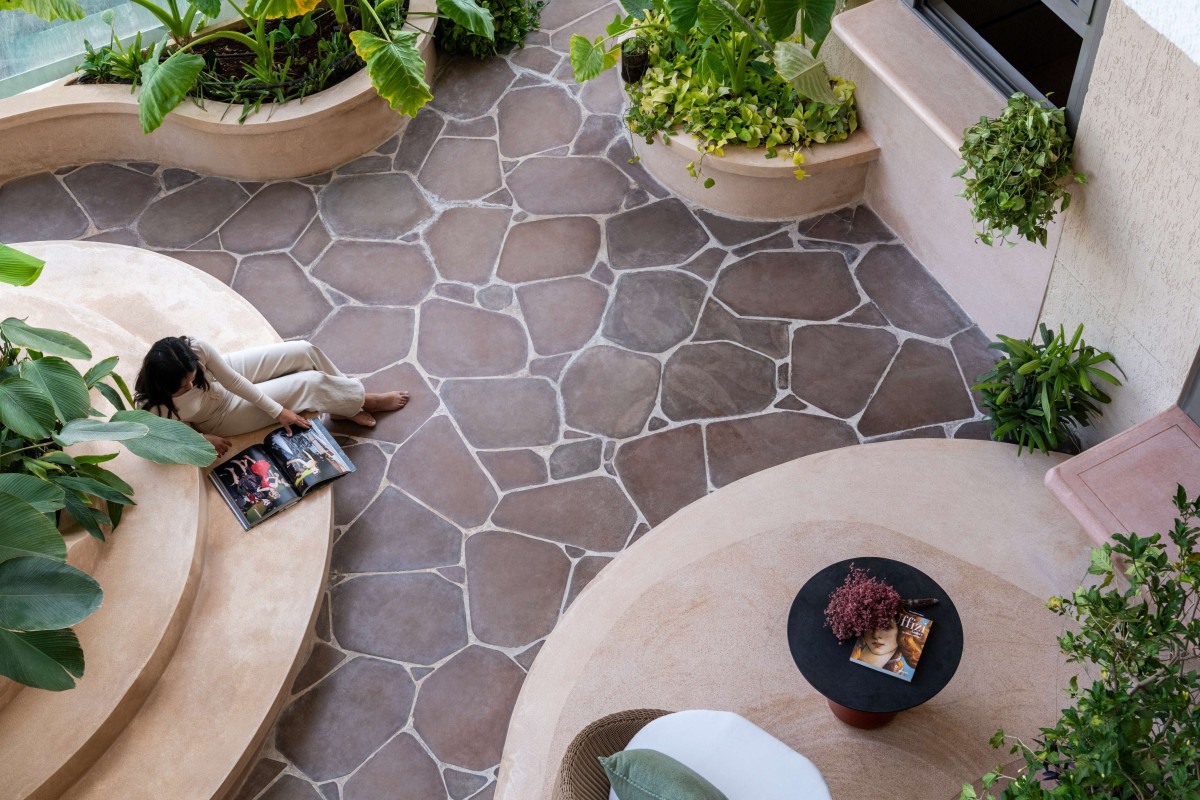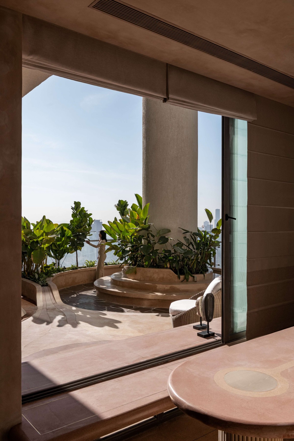 The design process presented challenges, particularly in balancing the expansive proportions of the triple-height terrace while maintaining a sense of intimacy. To address this, tall plants, strategic artworks, and varied flooring textures were incorporated to create visual interest and scale