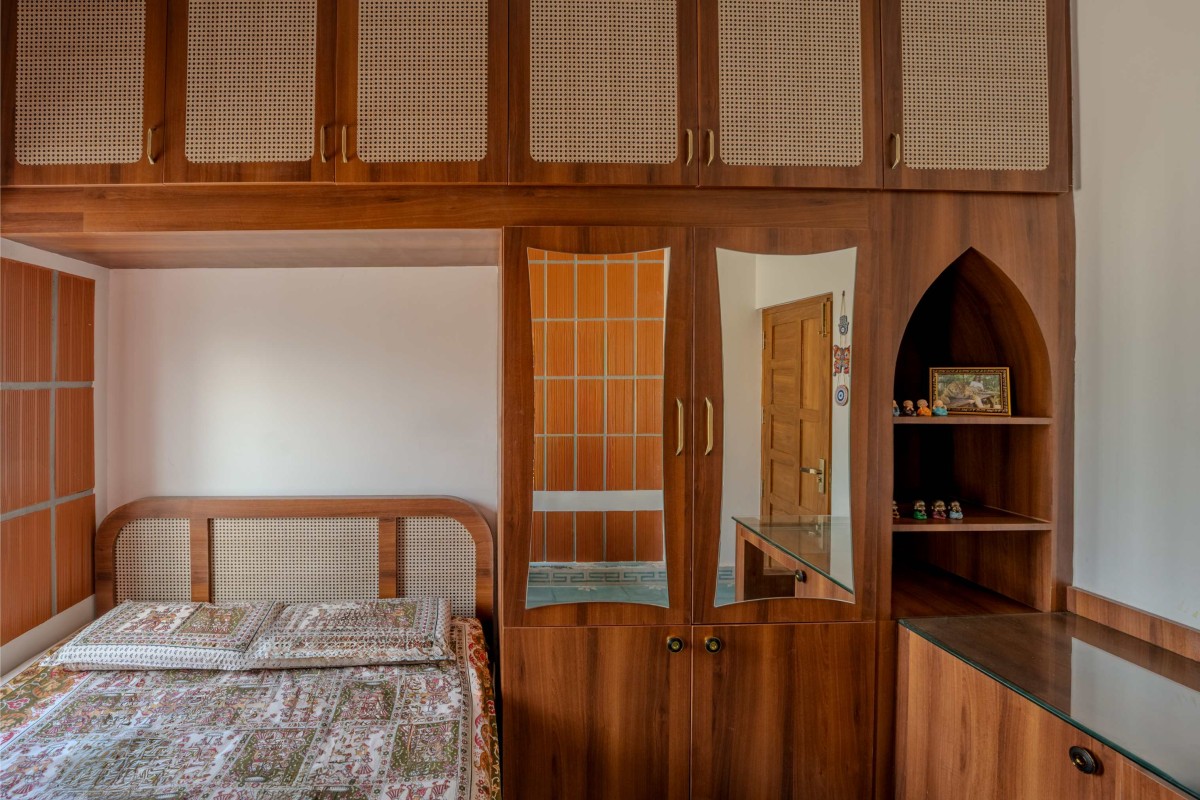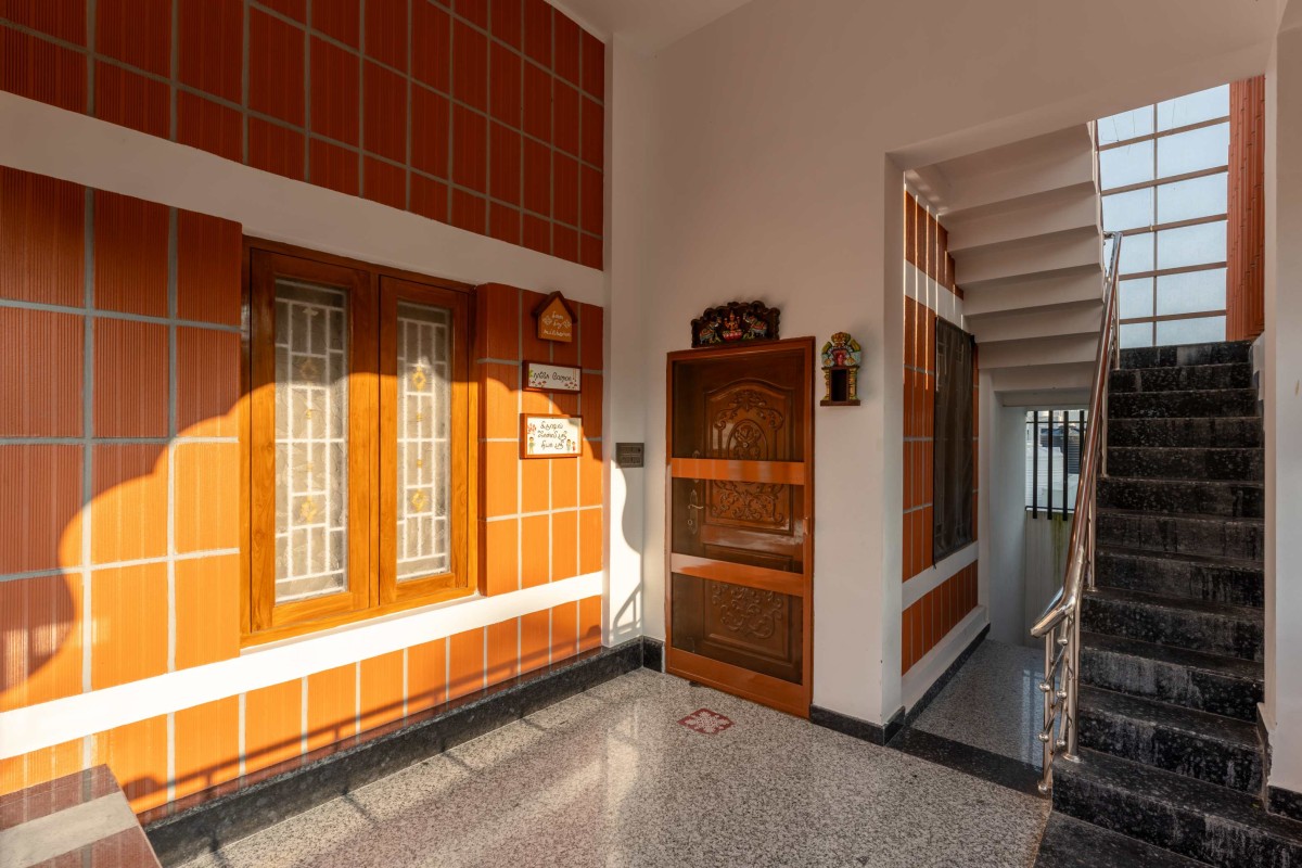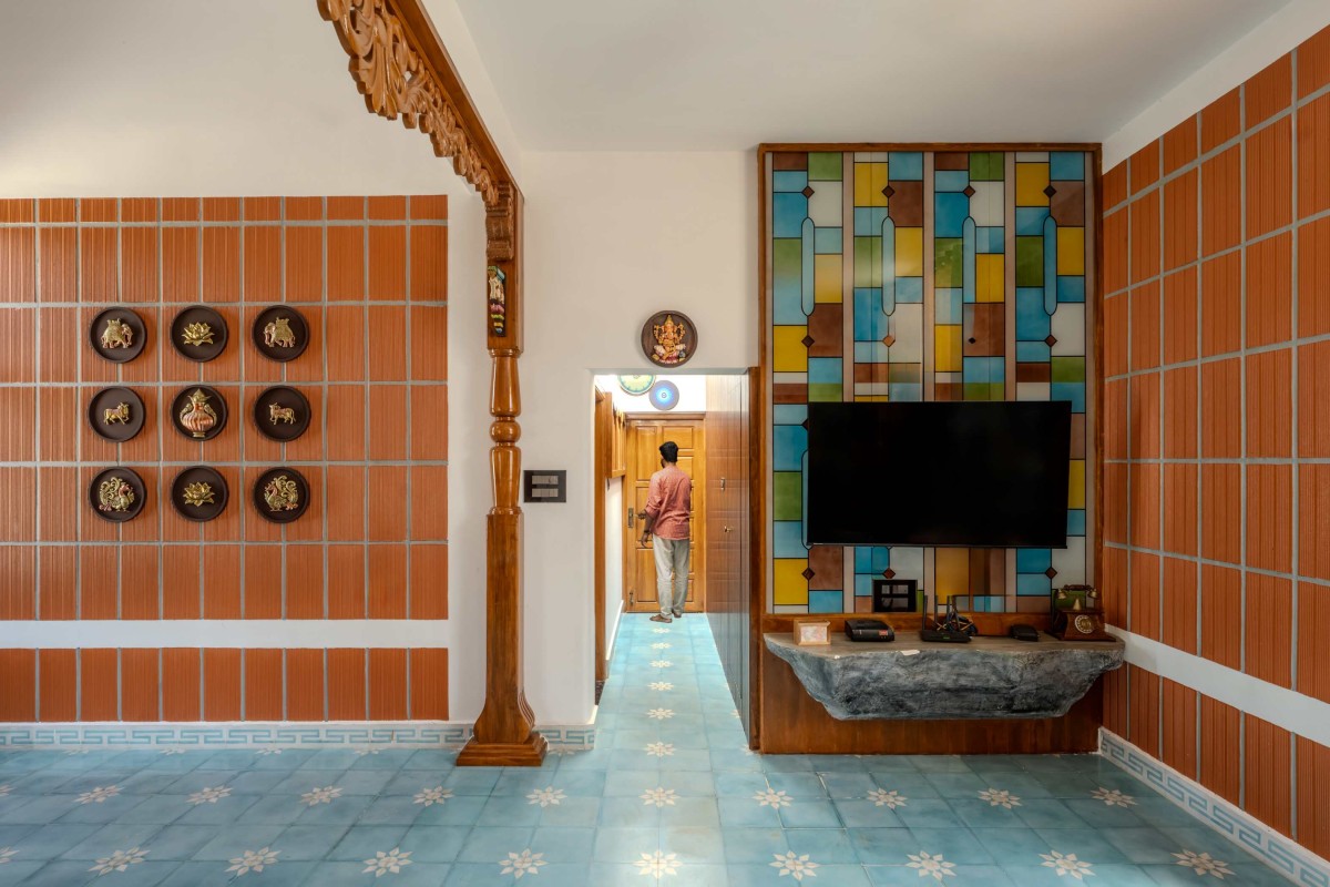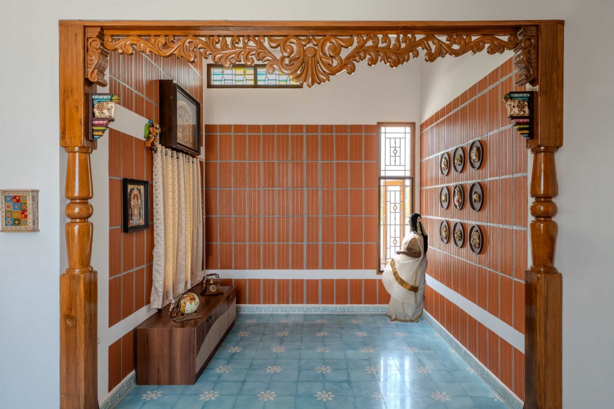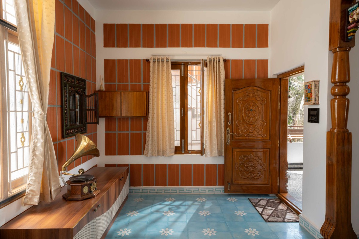 The interiors draw inspiration from traditional Chettinad architecture, blending craftsmanship with contemporary living. Athangudi tile flooring sets the foundation, complemented by traditional columns and intricately carved beam-to-column joints. Brass and wooden décor elements further reinforce the heritage-inspired theme.