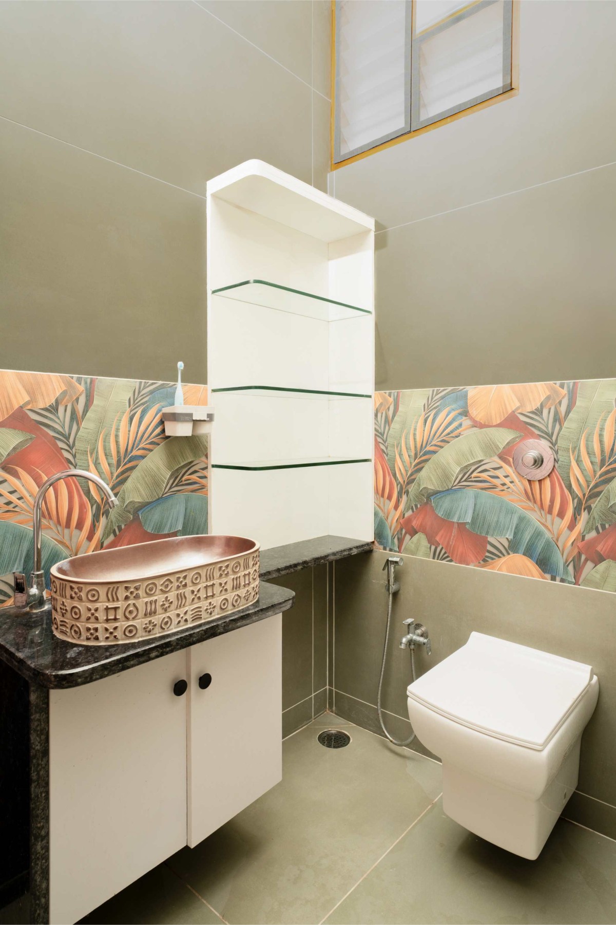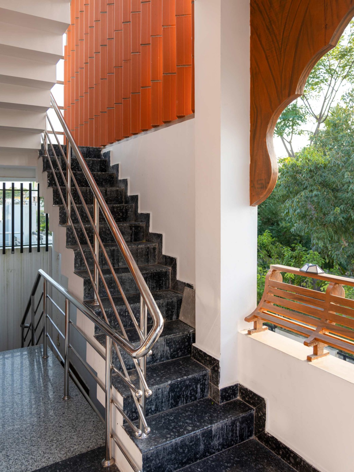 Material selection played a crucial role in achieving thermal comfort. The house is predominantly constructed using porotherm blocks, known for their insulation and energy efficiency. The southwestern façade is subtly inclined toward the northwest, enabling indirect daylight penetration while preventing direct heat gain. Traditional handmade Athangudi tiles are used for flooring throughout the house, enhancing thermal performance while adding cultural richness to the interiors.