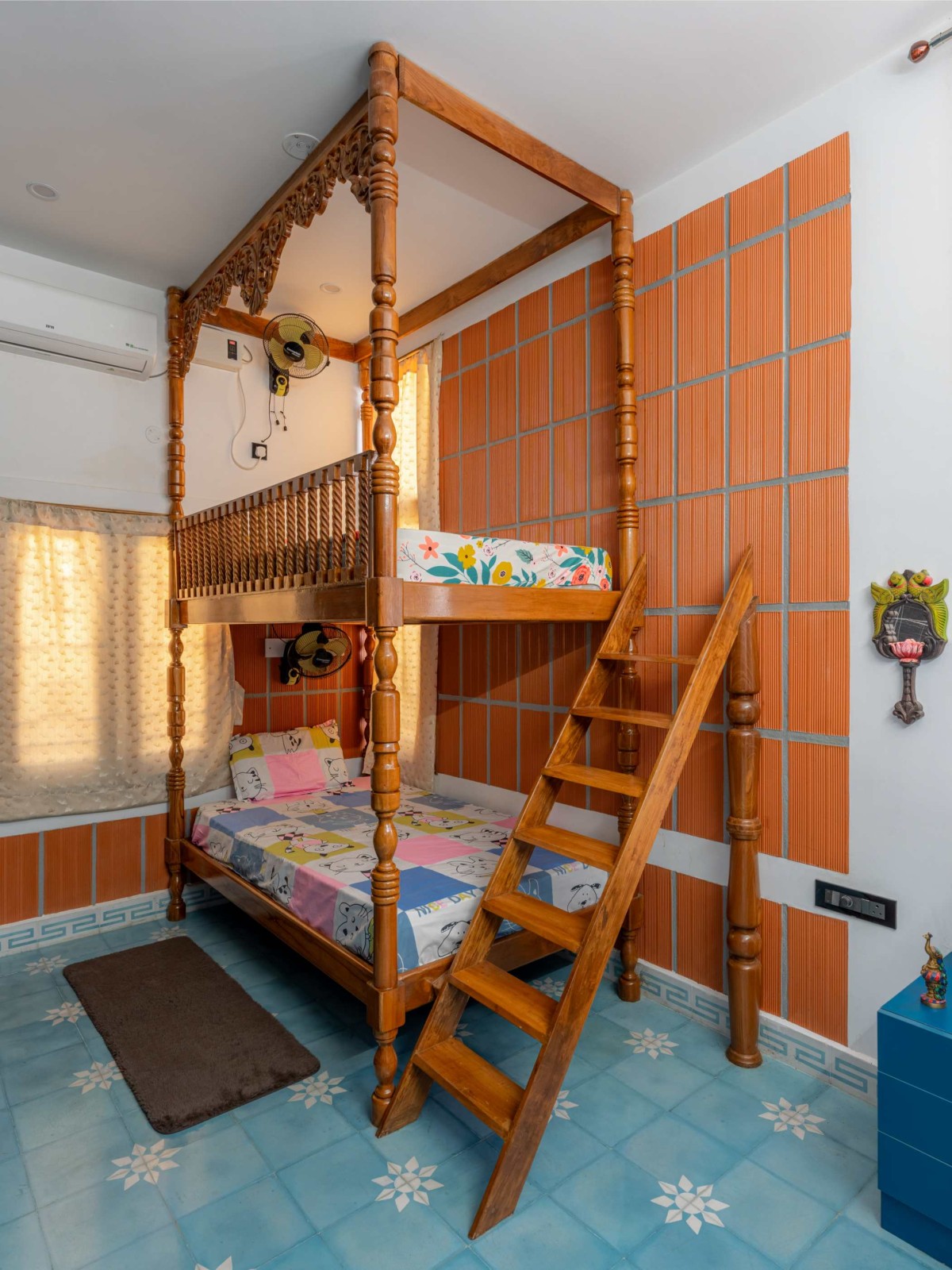 The kids’ bedroom features custom-designed bunk beds crafted in a traditional style, complete with carved wooden railings and a compact wooden staircase, making the space both functional and playful.