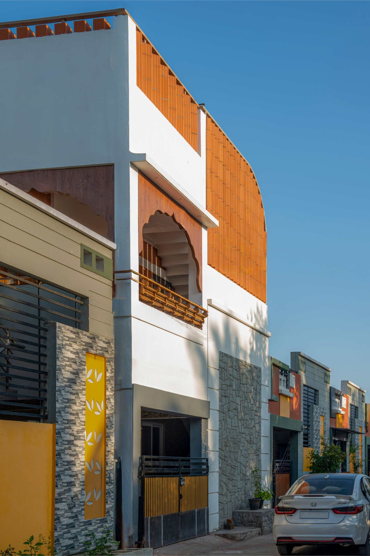 This project involves the transformation of an existing west-facing row house spread across a 1000 sq.ft plot. Located within a uniform row of houses sharing an identical façade language, the scope of work included façade elevation, construction of a first floor, and complete interior design and execution. The site enjoys a favorable context, opening toward a public park at the front while a small coconut grove forms a calm natural backdrop at the rear—elements that significantly informed the design approach.