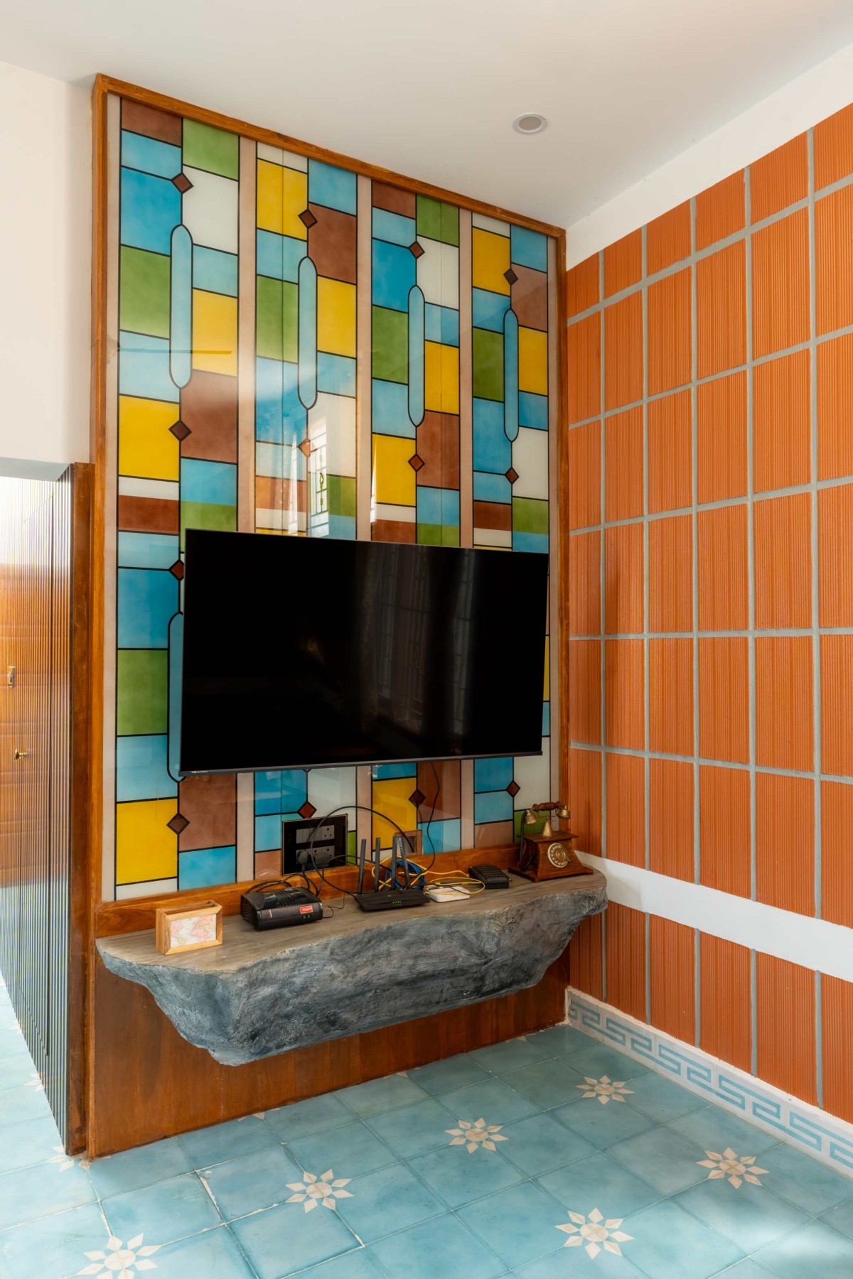 The TV unit serves as a focal point in the living area, designed using colored glass artwork. It is paired with a uniquely crafted TV table that resembles a rock form, finished with wooden mouldings and textured paint—adding an artistic and tactile dimension to the space.