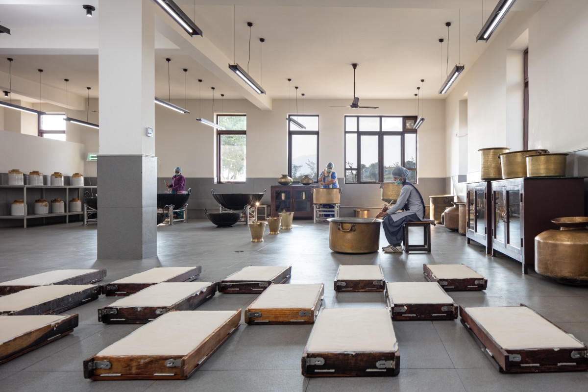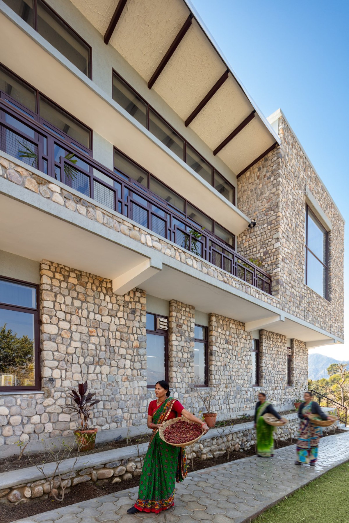 The Lodsi community project for Forest Essentials is nestled in the Himalayan foothills, along the banks of the river Ganges, in Rishikesh, India. The design brief stipulated by the client outlined the construction of a manufacturing facility for a modern skincare company that focuses on reviving the ancient science of Ayurveda. The brand’s philosophy of infusing ancient wisdom with contemporary aesthetics presented the design team with an opportunity to adapt vernacular construction techniques to create a contemporary production facility.