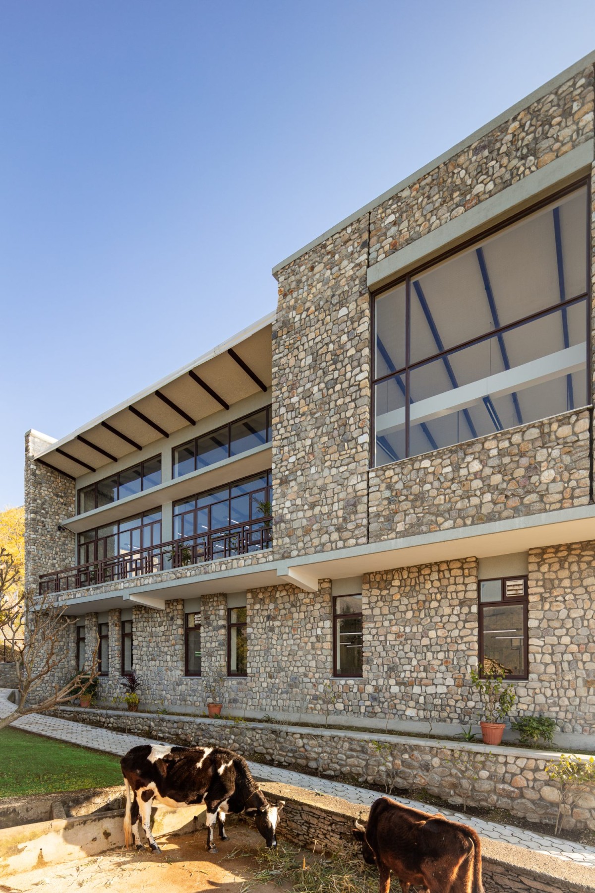 Passive design strategies and indigenous construction techniques resulted in a strong architectural expression that contextually blends in and builds community pride. Façade shading, window-to-wall ratio and building materials were optimised to ensure a high-thermal mass façade resulting in an energy-efficient building envelope with an EPI of 38kWh/m2/year. A solar roof generating 55kWp offsets the facility’s requirements and creates a surplus to supply back to the grid, hence rendering the design ‘Energy+’. A site-specific rainwater collection, storage tank and treatment system, and an effluent treatment plant offset the water requirements. Waste materials at the site have been repurposed and used, e.g., reclaimed wooden rafters as light fixtures, waste purlin sections as tube light holders, stone chisels as door handles, re-bar as wash basin pedestals, and others. Any organic by-product is reused or composted. This project is net-zero on energy, water, and waste. The planning incorporated the existing ‘gaushala’ (cow shed) to produce milk-based products.