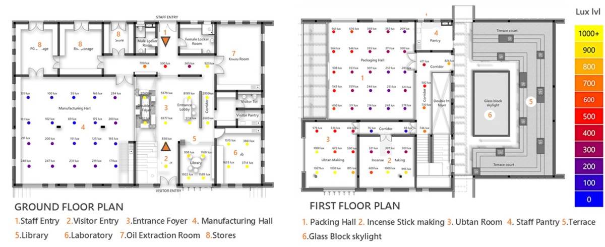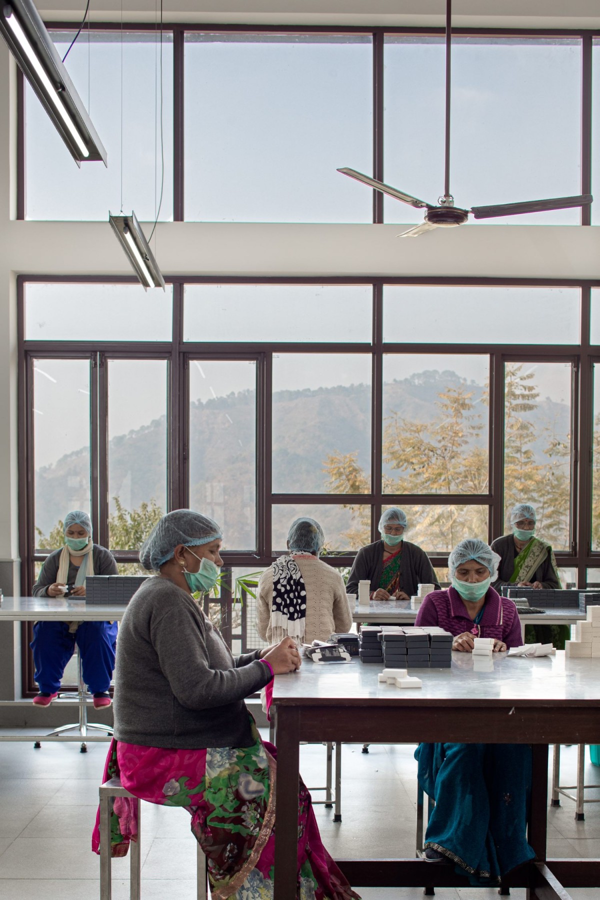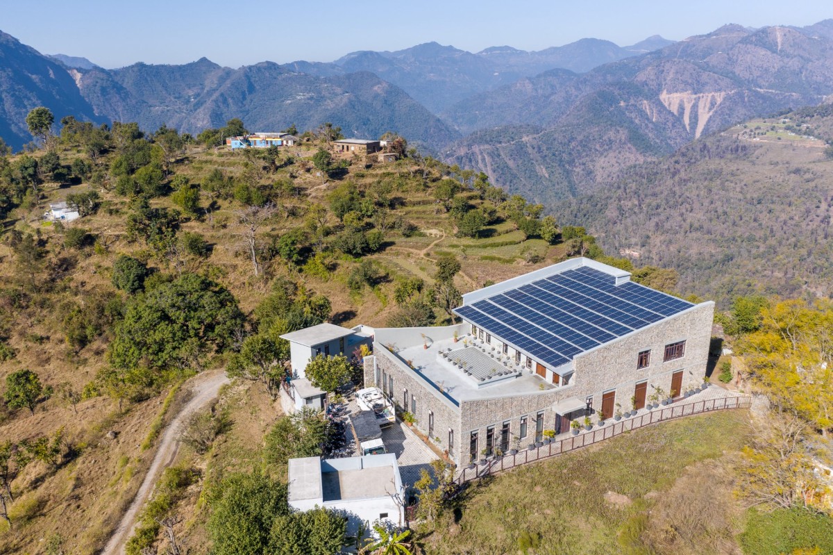 The built form draws inspiration from the traditional Garwahli ‘kholi’ (house). A rectilinear volume-oriented along the East-West axis has been planned with a central entry that divides the facility into two parts. Functions that require a cooler environment (herb grinding, packaging, and storage) are located on the upper floor, whereas the preparatory functions with high internal heat gain are located on the lower floor. The North-South oriented butterfly roof form allows large openable windows that allow the prevailing North-East and South-East winds for ventilation, with 80% naturally day-lit spaces and unobstructed views of the valley. The high-volume of space with operable clerestory windows enforces Bernoulli’s principle and moderates indoor temperatures. A central light-well forms a multi-purpose communal space. This also doubles up as mother and child wellness camps and for students post-school.