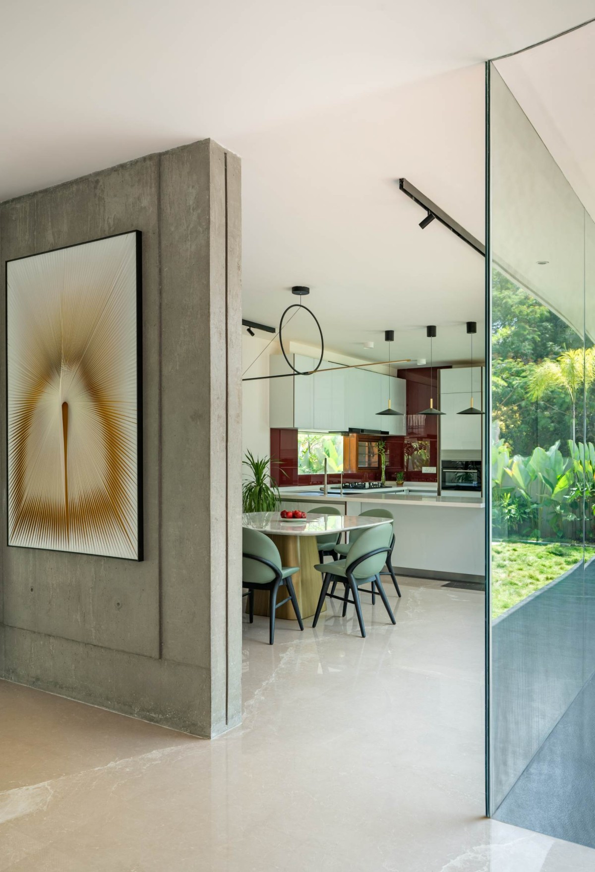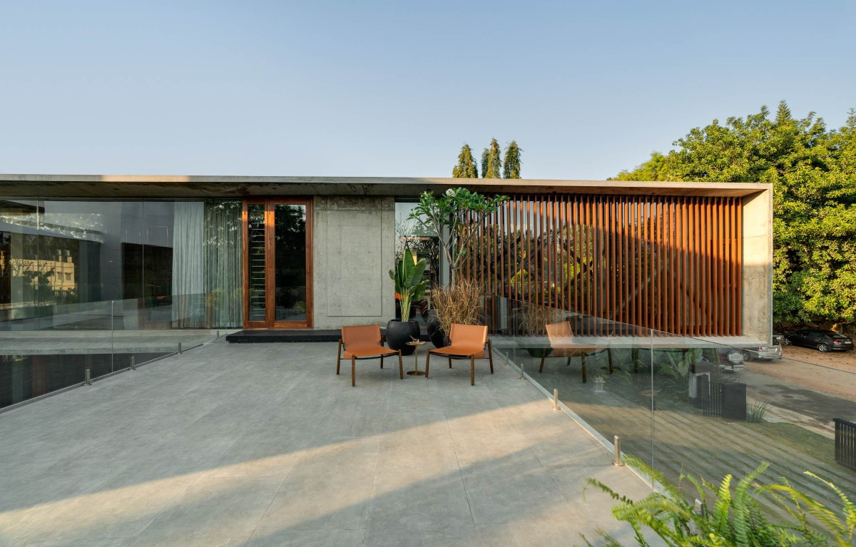 Materiality across the house is restrained, honest, and tactile. Exposed concrete, solid teak wood, natural stone, and steel are left in their raw, elemental states—celebrating the essence of each surface, the weight of structure, and the marks of craftsmanship.