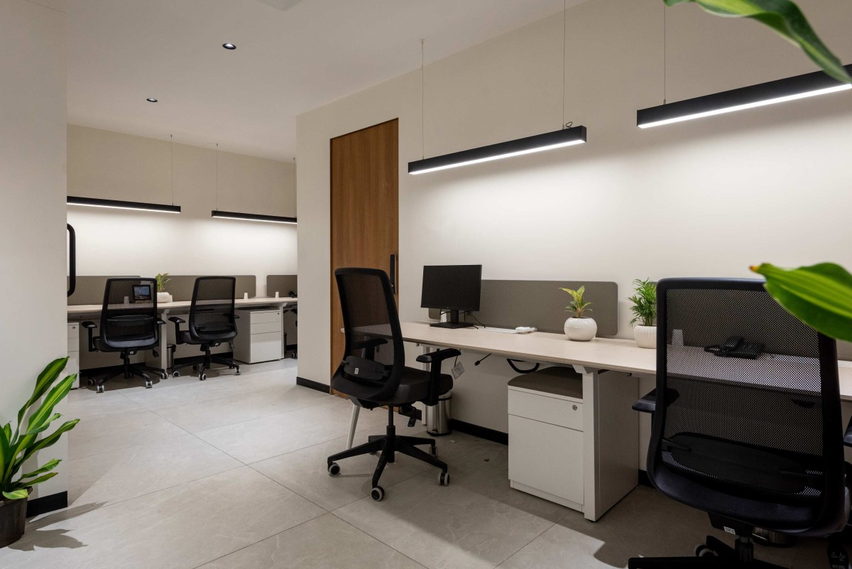 Workstations are thoughtfully planned with ergonomically designed desks, optimized storage solutions, and well-balanced lighting that ensures both comfort and productivity. Complementing these formal zones, the breakout spaces provide informal seating arrangements that encourage brainstorming, collaboration, and moments of relaxation. The material palette emphasizes sustainability, featuring textured finishes and biophilic elements such as indoor plants that bring warmth and vitality to the interiors. Lighting plays a pivotal role throughout, combining natural daylight with efficient LED fixtures and focused task lighting to enhance well-being and minimize eye strain.