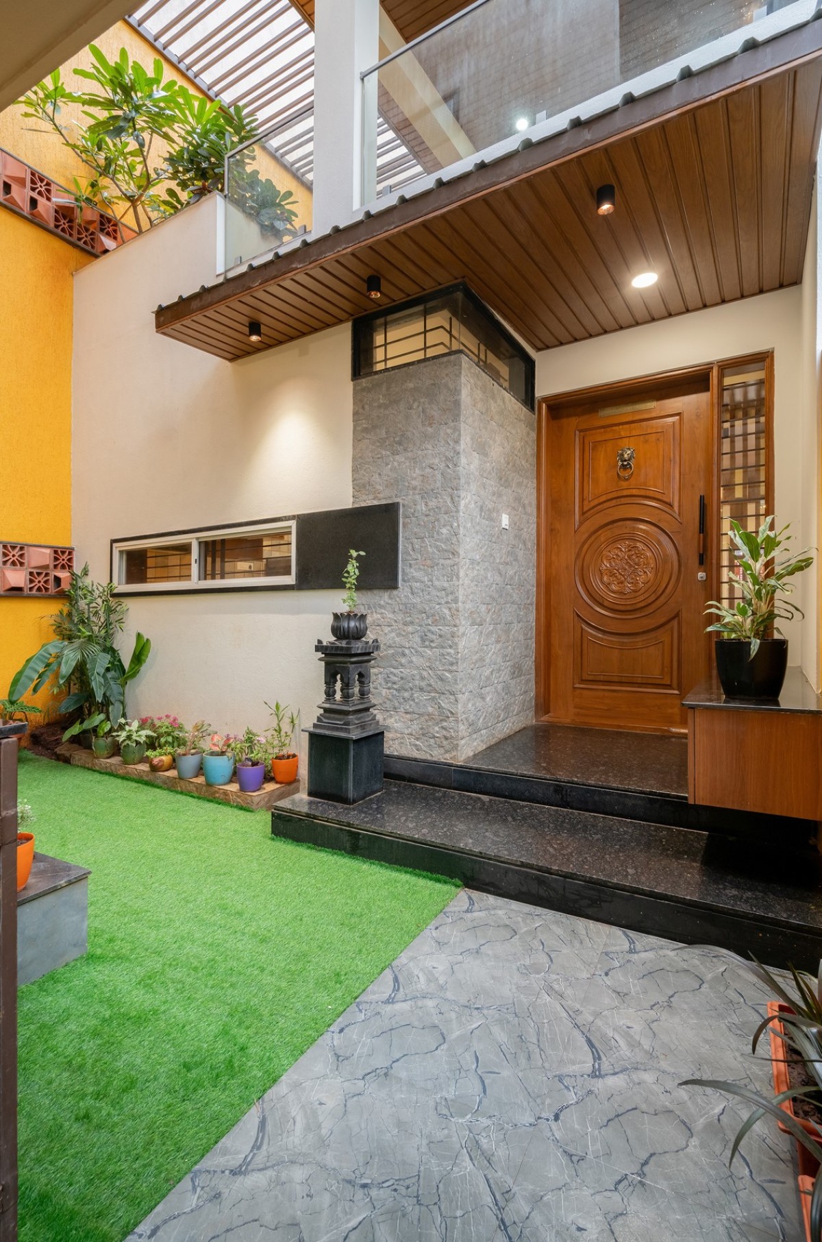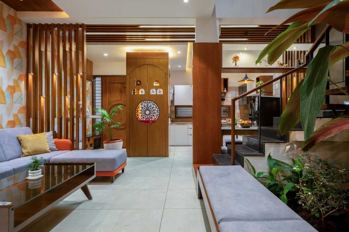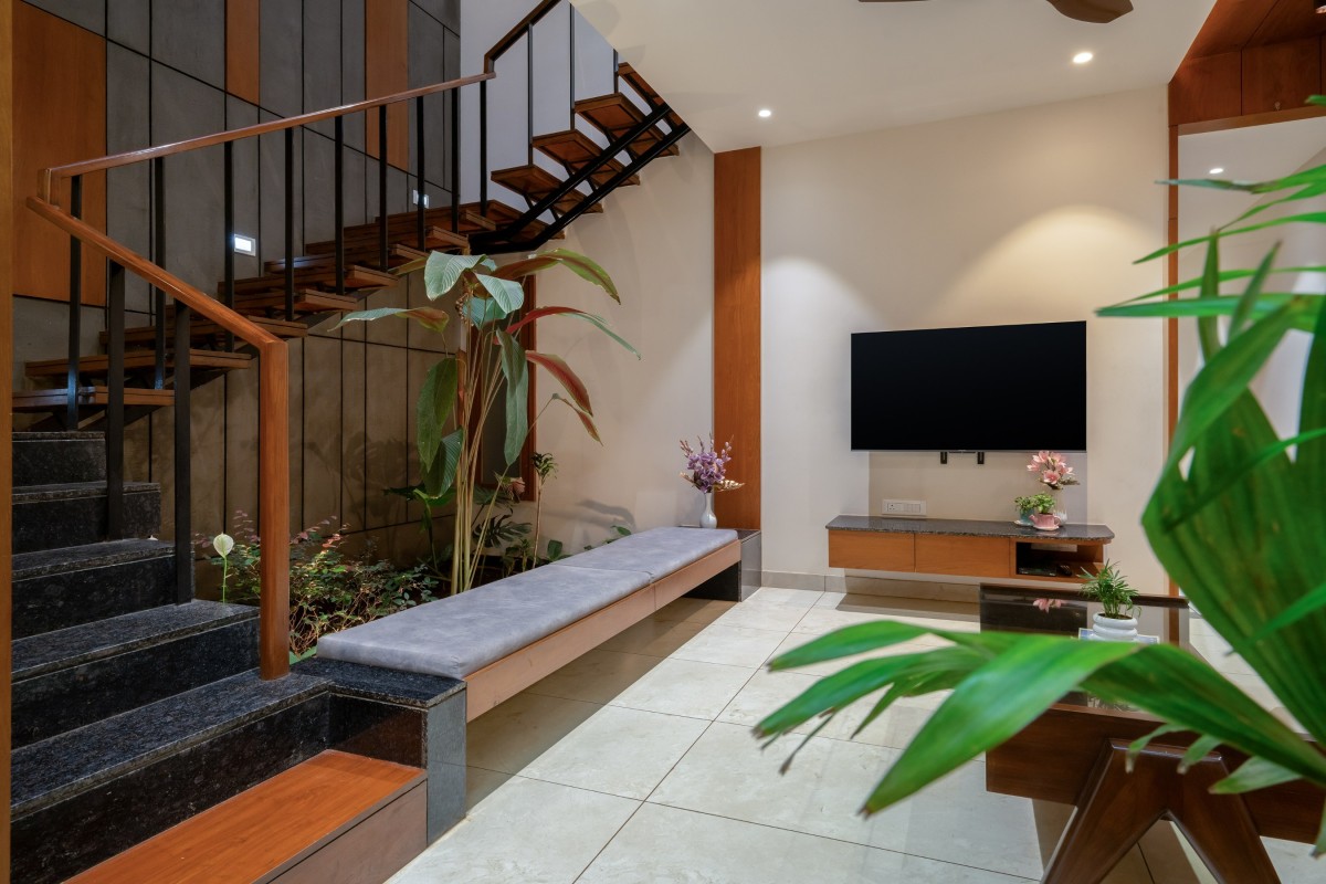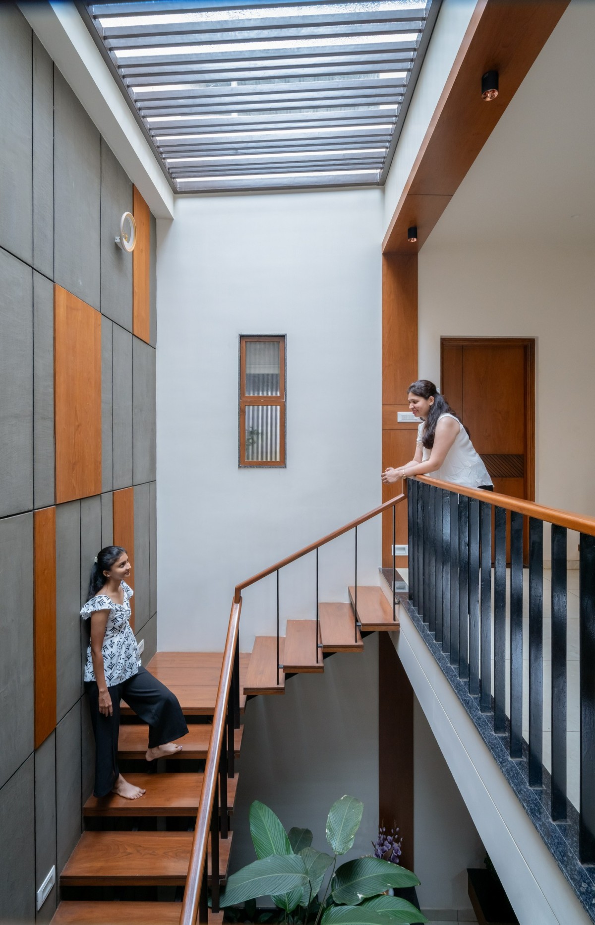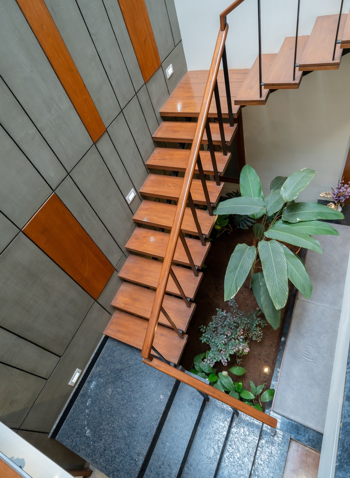 The open-plan layout on the ground floor seamlessly integrates the living, dining, and kitchen areas, fostering a harmonious flow. The living room, nestled behind the entrance, strikes a perfect balance between warmth and elegance, exuding refined sophistication. The central courtyard, adjacent to the living room, enhances this ambiance, serving as the heart of the home and fostering a sense of openness and unity. The staircase wall features striking rectangular panels in alternating colours, crafting a dynamic visual pattern. A sleek wooden handrail and elegant black balustrade bring sophistication and safety to the design. Natural light pours in through a skylight, illuminating the space and elevating its ambiance. The staircase's modern charm is defined by clean lines and a minimalist aesthetic, complemented by double height ceilings, exposed concrete, wood panelling, and a wooden staircase. Nature-friendly materials like stone, wood, and steel weave a tale of eco-conscious design, promoting sustainability and harmony with the environment.