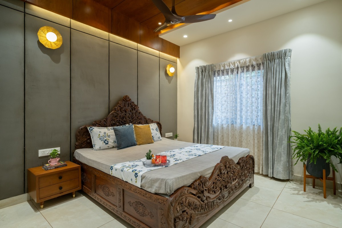 The master bedroom's interior showcases a harmonious blend of natural wooden finishes, polished concrete panels, and grey grooved details. The existing wooden carved bed contrasts wood's warmth with the raw, solid materiality of concrete, creating a dynamic interplay of textures and colours, adding depth and visual interest to the space. The thoughtful design showcases a deep understanding of the occupants' needs, cleverly utilizing space and incorporating sustainable features that not only reduce environmental impact but also elevate the living experience.
